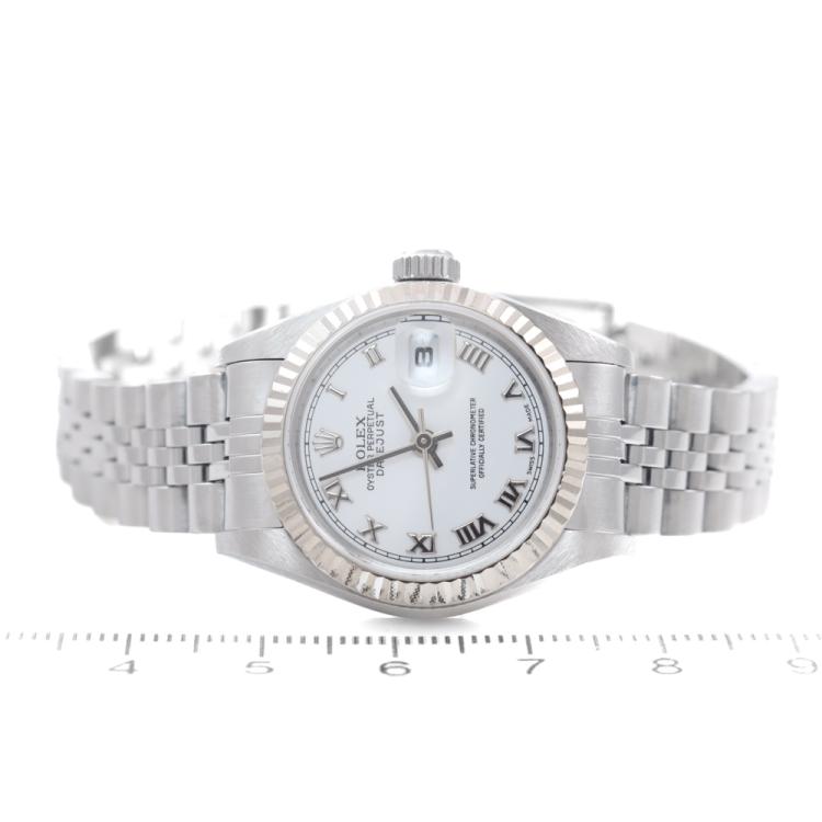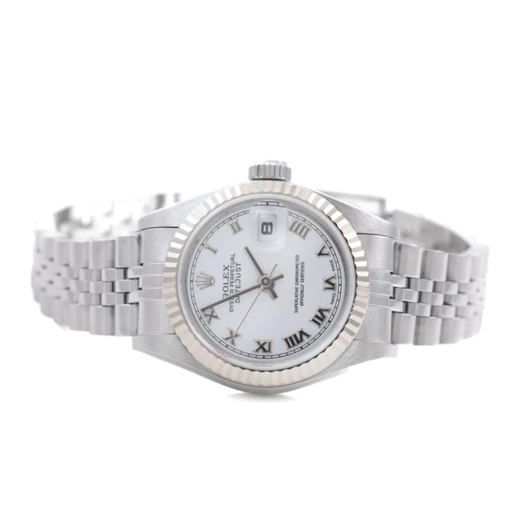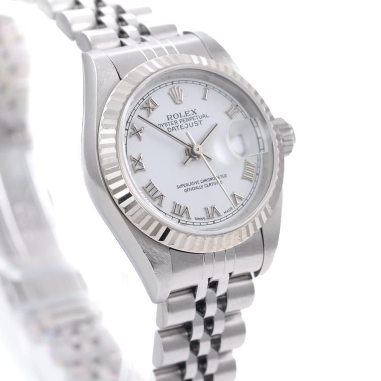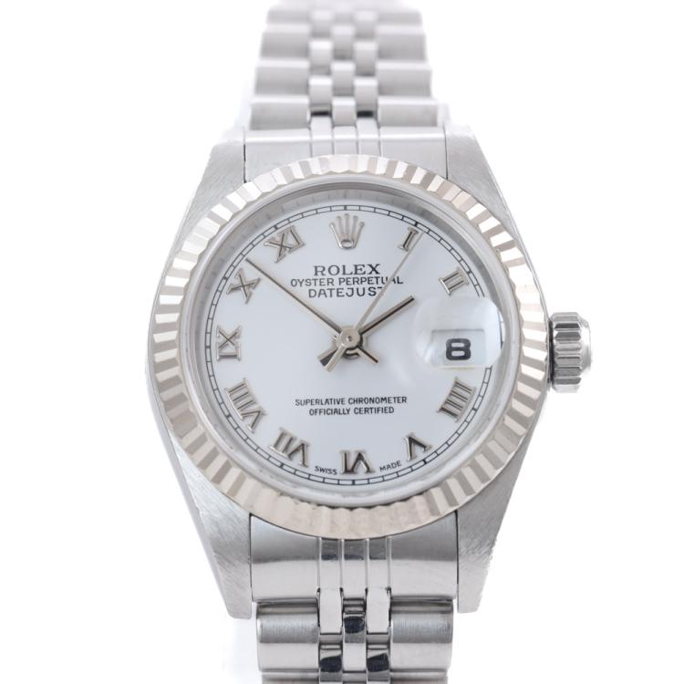 Rolex Oyster Perpetual Datejust 18ct white gold and stainless steel automatic ladies watch. White dial, date, case diameter: 26mm, wrist size: 17cm, Swiss made. Ref: 79174. Circa: 1999. With Rolex stainless steel Jubilee bracelet and clasp. With Certificate of Authenticity and Rolex box. 3 month FSA warranty (Pre-owned)