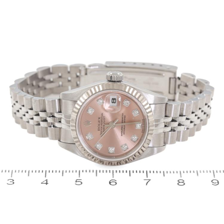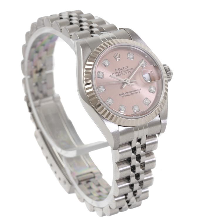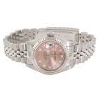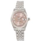 Rolex Oyster Perpetual Datejust stainless steel automatic ladies watch. Salmon colour dial, Diamond indicators, 18ct white gold fluted bezel, date, case diameter: 26mm, wrist size: 16cm, Swiss made. Ref# 79174G. Circa: 2002. With Rolex stainless steel Jubilee bracelet and clasp. With Certificate of Authenticity and Rolex box. 3 month FSA warranty. (Pre-owned)