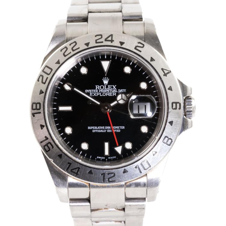 Rolex Oyster Perpetual Explorer II stainless steel automatic mens watch. Black dial, date, case diameter: 40mm, wrist size: 17.5cm, Swiss made. Ref# 16570. Circa: 2001. With Rolex stainless steel Oyster bracelet and clasp. With Certificate of Authenticity and Rolex box. 3 month FSA warranty (Pre-owned)