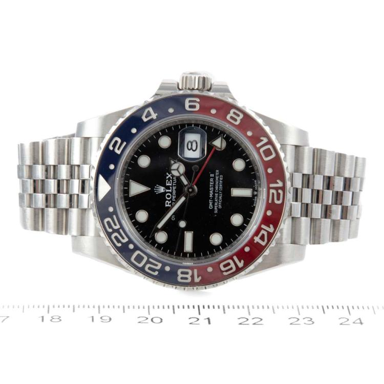 Rolex Oyster Perpetual GMT-Master II stainless steel automatic mens watch. Black dial, date, case diameter: 40mm, wrist size: 18cm, Swiss made. Ref# 126710BLRO. Circa: 2011 - 2024. With Rolex stainless steel Jubilee bracelet and clasp. With Certificate of Authenticity, Rolex International Guarantee card dated 01/19/2020 and Rolex box. Balance of 5 year Rolex manufacturer warranty applies. (Pre-owned)