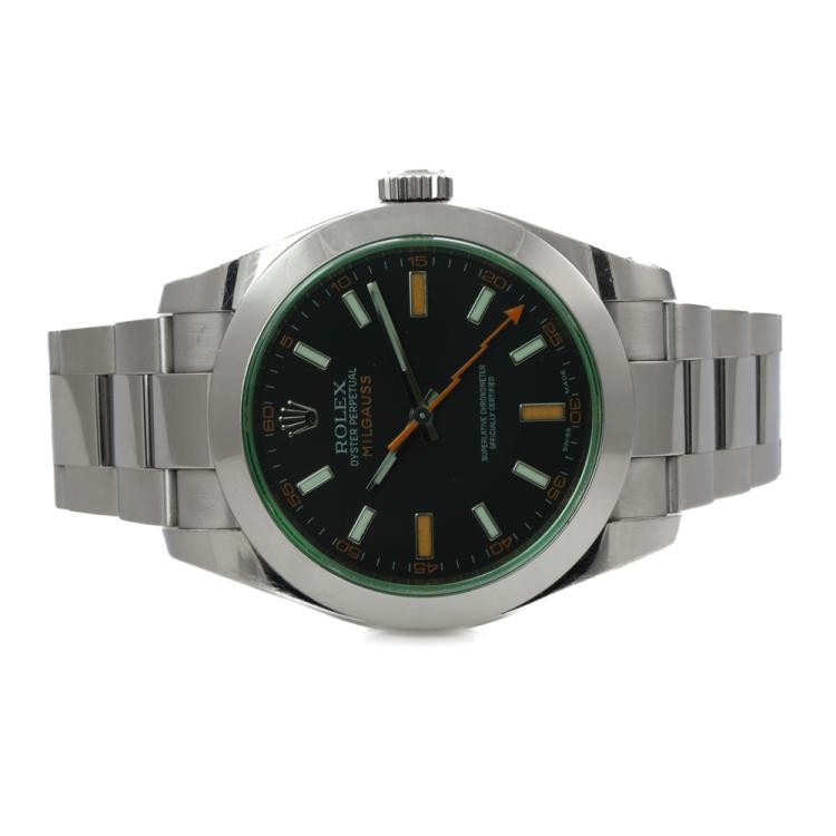 Rolex Oyster Perpetual Milgauss stainless steel automatic mens watch. Black dial, case diameter: 40mm, wrist size: 18.5cm, Swiss made. Ref# 116400GV, Circa: 2007 or 2008. With Rolex stainless steel Oyster bracelet and clasp. With Certificate of Authenticity, International Guarantee Card dated 10/11/2008 and Rolex box. 3 month FSA warranty. (Pre-owned)