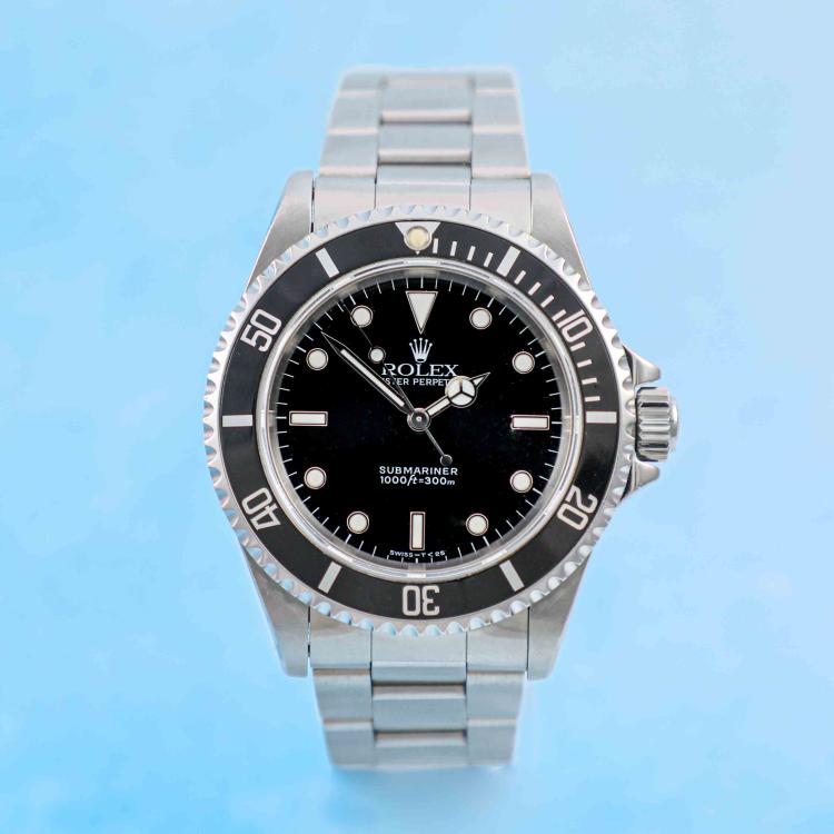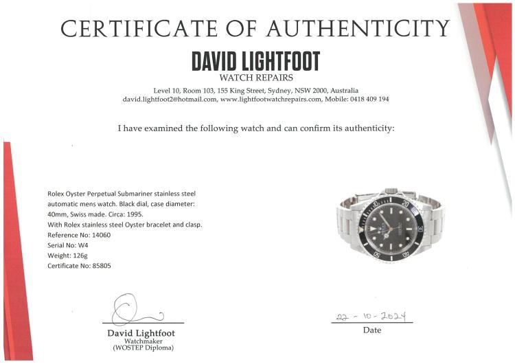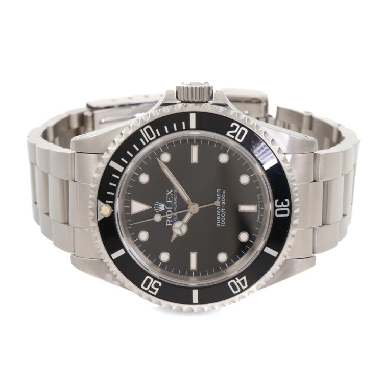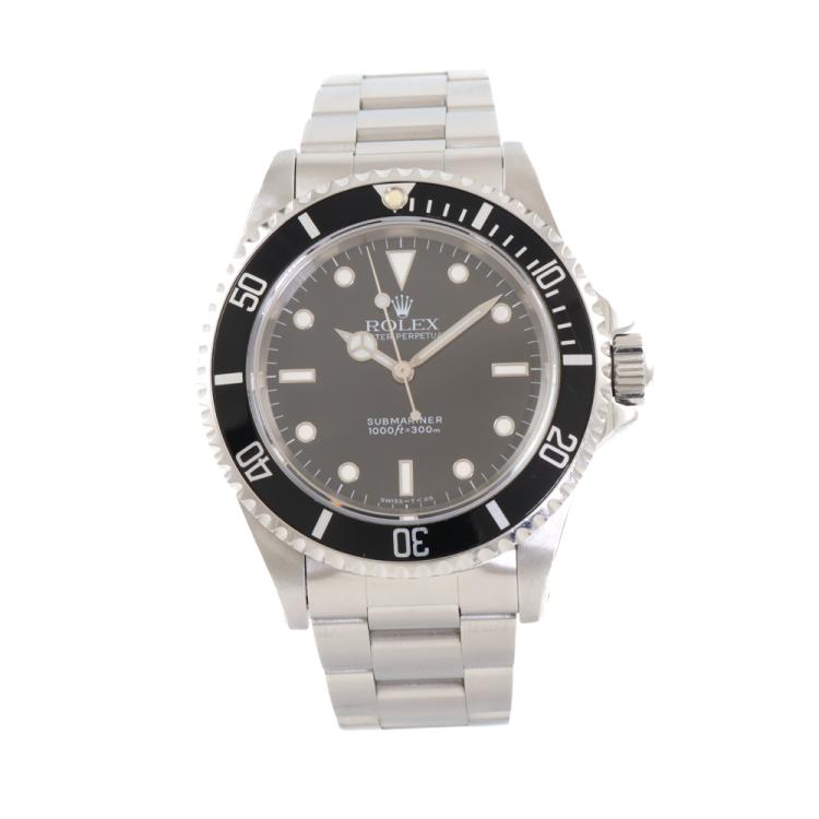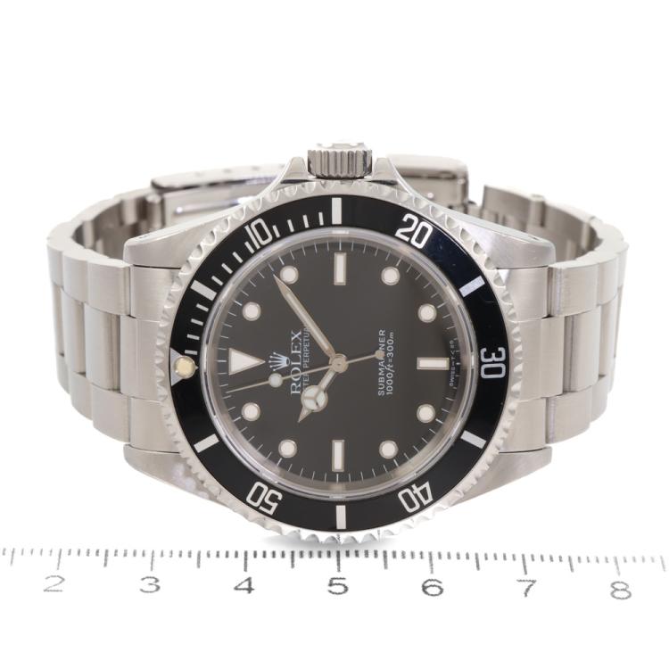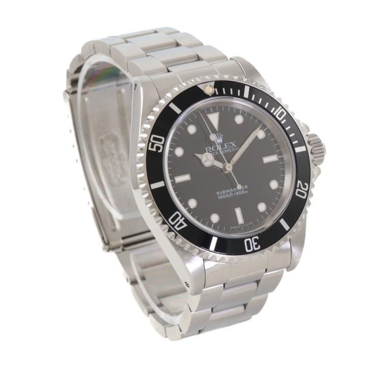Rolex Oyster Perpetual Submariner stainless steel automatic mens watch. Black dial, case diameter: 40mm, wrist size: 19cm, Swiss made. Ref #14060. Circa: 1995. With Rolex stainless steel Oyster bracelet and clasp. With Certificate of Authenticity and Rolex box. 3 month FSA warranty (Pre-owned)