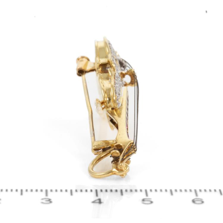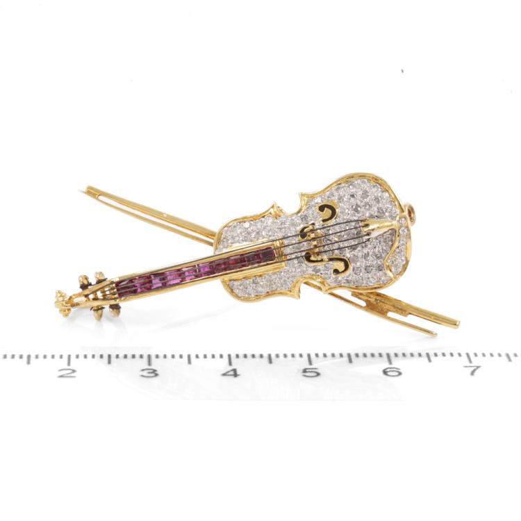 Ruby and Diamond Violin Brooch/pendant with square cut Natural Rubies totalling approximately 0.60ct and round Natural Diamonds totalling approximately 0.50ct (Estimated grading: H P1). 18ct yellow gold. Weight: 12.0g. (Pre-owned)