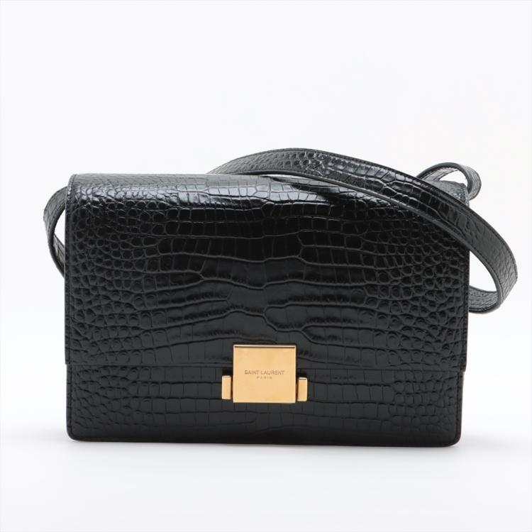 Saint Laurent medium Bellechasse shoulder bag in black crocodile-embossed calfskin leather. Featuring aged gold-toned hardware, and an adjustable shoulder strap. The frontal flap with a logo plate press-lock closure opens to a black suede interior with patch pockets. Approximate dimensions: 24cm(L) x 16cm(H) x 11cm(D), strap drop 45-58cm. Accompanied by a YSL dustbag. With Entrupy Certificate of Authenticity. (Pre-owned)