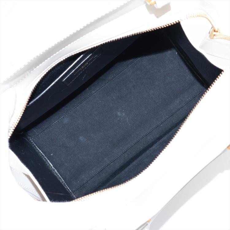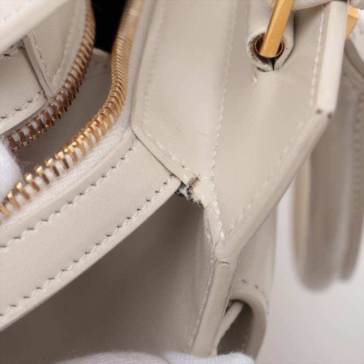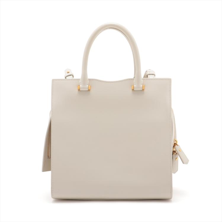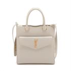 Saint Laurent Paris small Uptown tote in cream white smooth calfskin leather. Featuring gold-toned hardware, rolled leather handles, detachable and adjustable shoulder strap, and a detachable pouch at front pocket. The zipper closure opens to a black textile interior with a patch pocket. Approximate dimensions: 23cm(L) x 22.5cm(H) x 11cm(D), handle drop 10cm, strap drop 57cm. Accompanied by a YSL dustbag. With Entrupy Certificate of Authenticity. (Pre-owned)