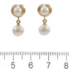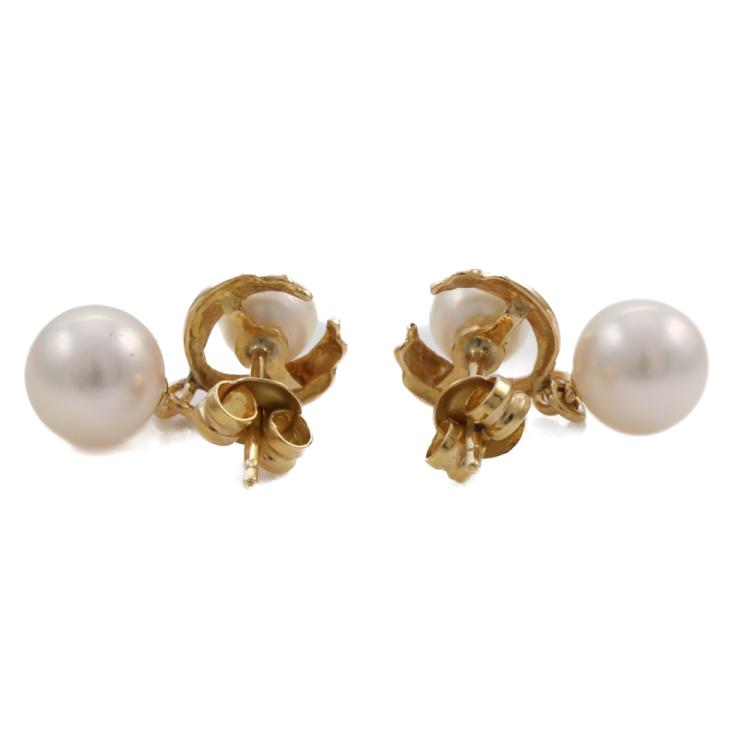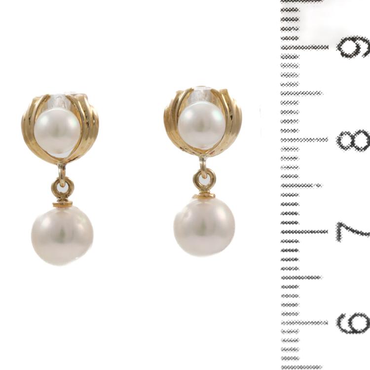 Set of Pearl necklace and earrings. 1) Pearl necklace with 54 Akoya Pearls of 6.5 - 6.9mm. 14ct yellow gold clasp set with a seed Pearl of 3mm. Length: 42cm. 2) Pearl drop earrings with Akoya Pearls of 4.8mm & 6.6mm. 18ct yellow gold. Drop length: 1.8cm. Total Weight: 26.2g. (Pre-owned)