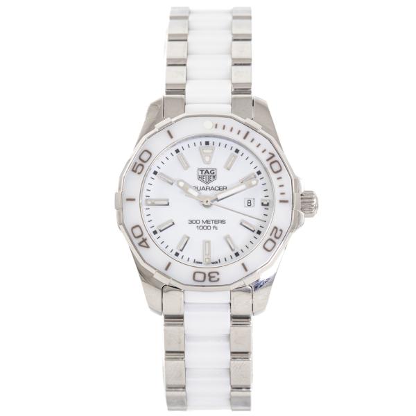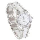 TAG Heuer Aquaracer ceramic and stainless steel quartz ladies watch. White dial, date, case diameter: 29mm, wrist size: 18.5cm, Swiss made. Ref# WAY141B. With TAG Heuer stainless steel & ceramic bracelet and clasp. With Certificate of Authenticity and TAG Heuer box. 3 month FSA warranty. (Pre-owned)
