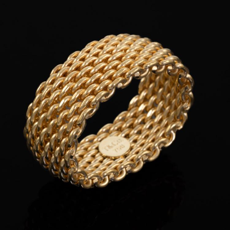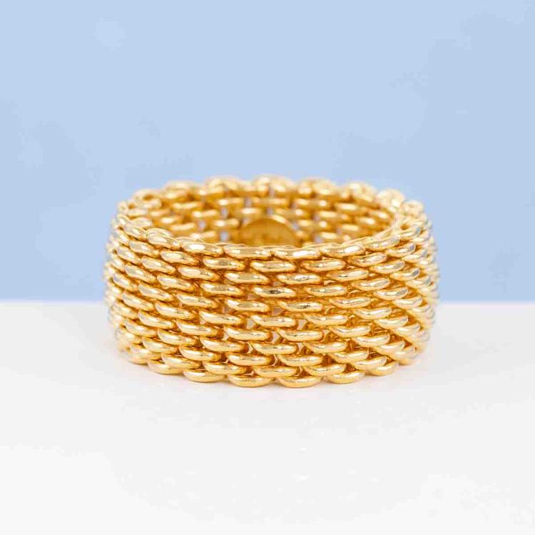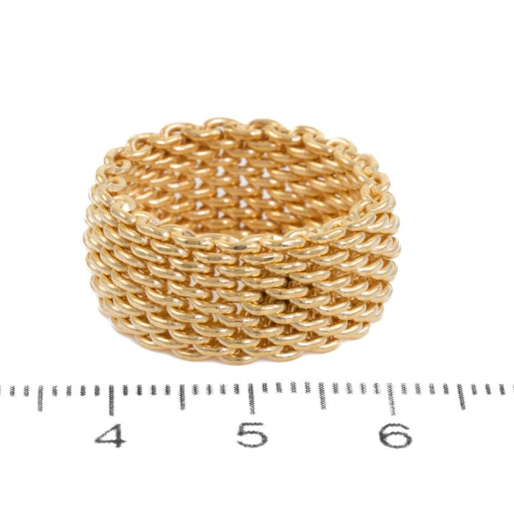 Tiffany & Co Somerset mesh band ring. 18ct yellow gold. Ring size N1/2 - ring resizing is not recommended. Band width: 9.9mm. Weight 12.8g. (Pre-owned)