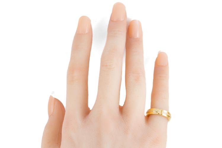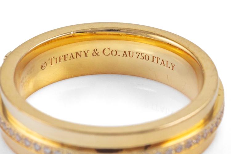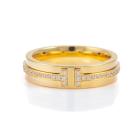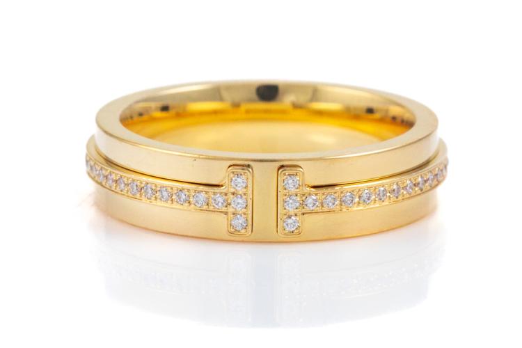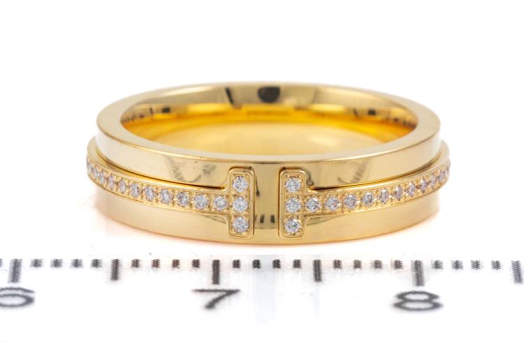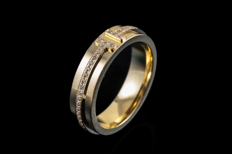 Tiffany & Co Tiffany T Narrow ring with round Diamonds totalling 0.13ct. 18ct yellow gold. Made in Italy. Ring size H - ring resizing is not recommended. Weight: 5.5g. Width: 4.5mm. With Tiffany & Co box. (Pre-owned)