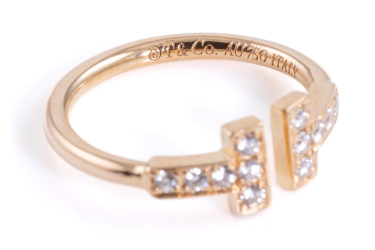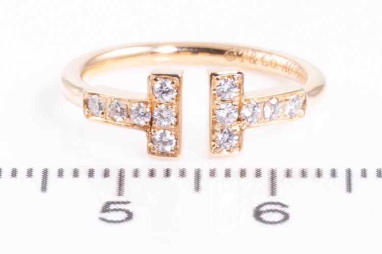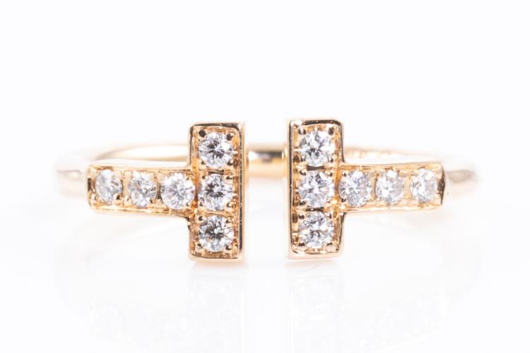 Tiffany & Co. T Wire Diamond ring with 12 round Natural Diamonds totalling 0.13ct. 18ct rose gold. Made in Italy. Ring size G, - ring resizing is not recommended. Band width: 16.5mm. Weight: 2.2g. (Pre-owned)