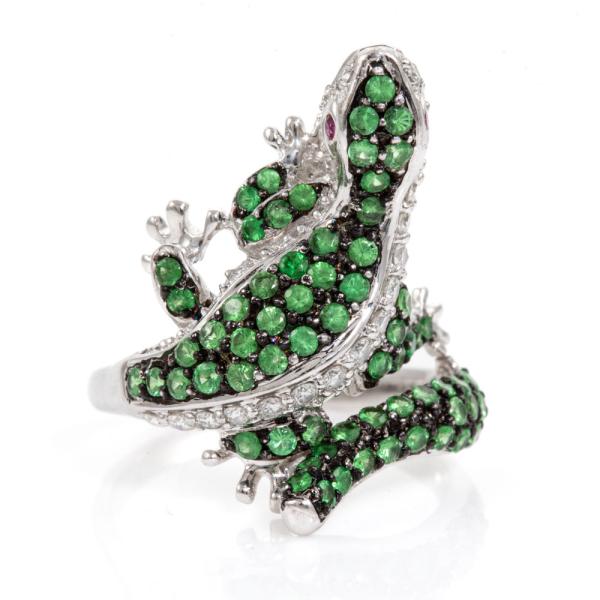 Tsavorite, Ruby and Diamond ring with round Natural Tsavorite (Green Garnet) totalling 1.32ct, round Natural Rubies totalling 0.03ct and round Natural Diamonds totalling 0.63ct (Estimated grading: G-H SI). 18ct white gold. Ring size Q1/2. Band width: 2.5mm - 3.8mm. Weight: 10.7g. With Certificate #417858. (Pre-owned)