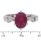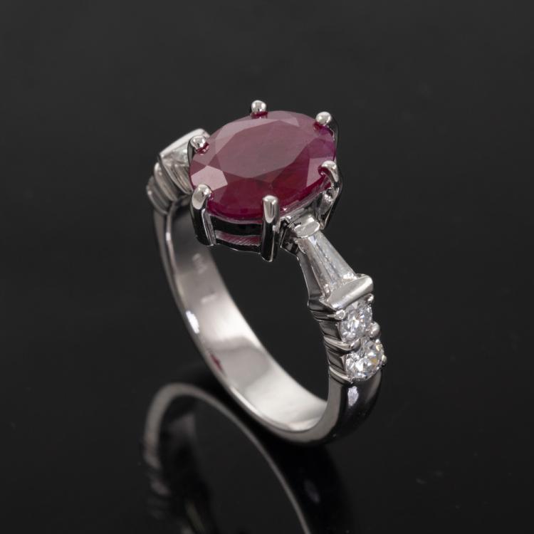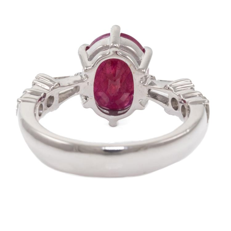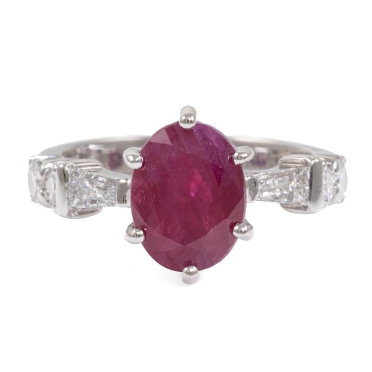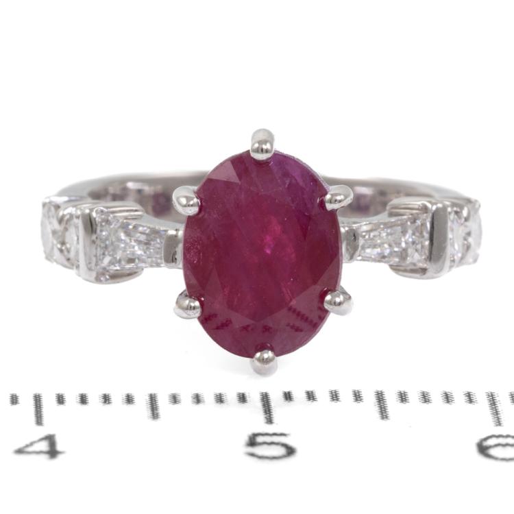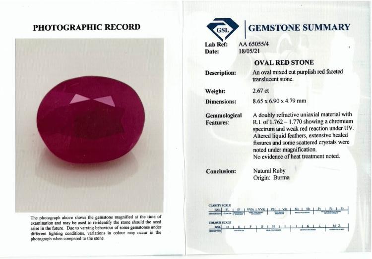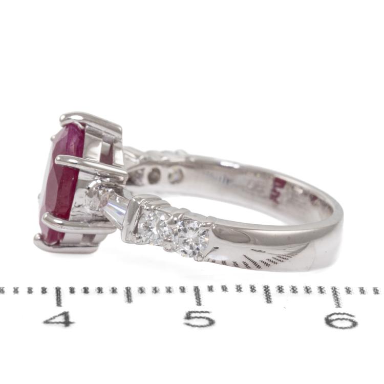 Ruby and Diamond ring with oval shape Natural Unheated Burmese Ruby of 2.67ct (with GSL Gemstone Summary Report #AA65055/4) and round & baguette cut Natural Diamonds totalling approximately 0.48ct (FSA estimated grading G-H VS-SI). Platinum 600 XRF tested but stamped "900". Ring size J - ring resizing is not recommended. Band width: 3.2mm - 3.6mm. Weight: 5.4g. (As New)