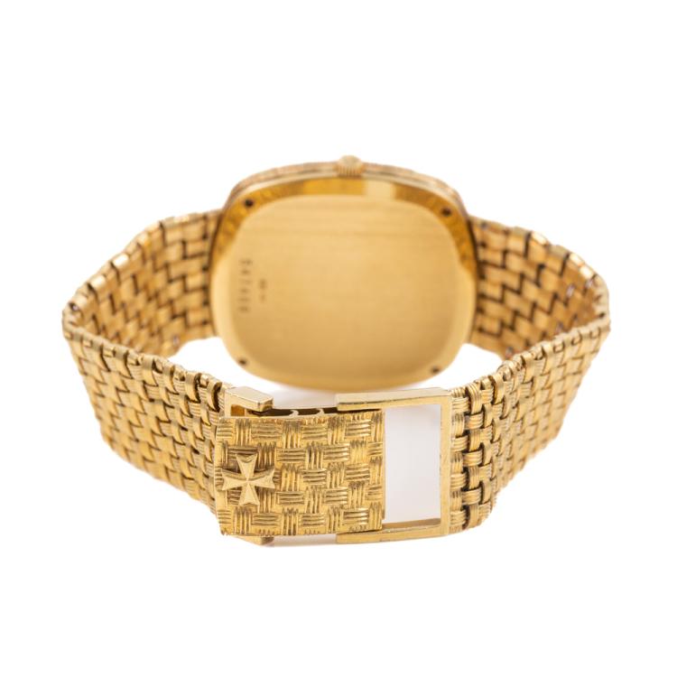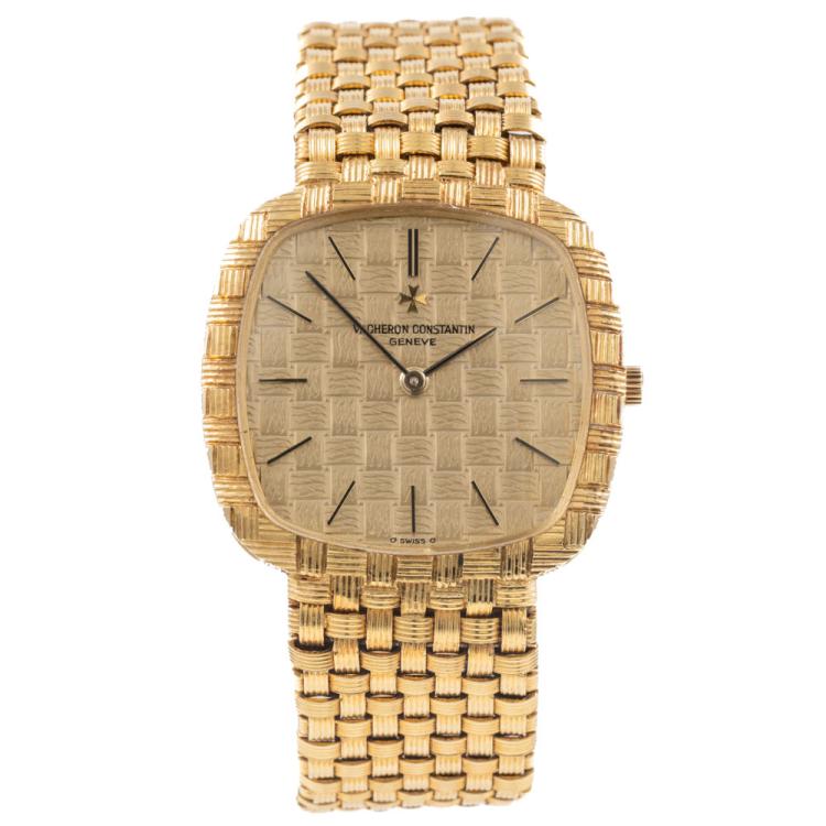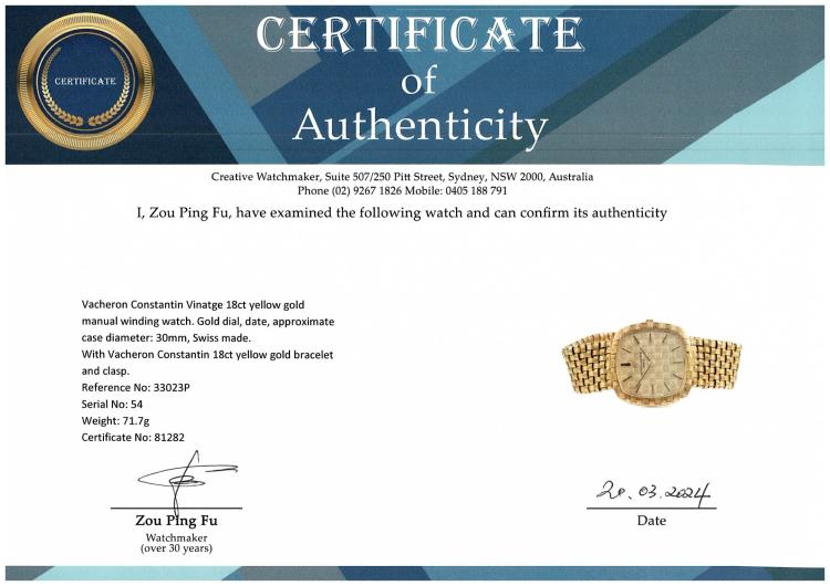 Vacheron Constantin Vintage 18ct yellow gold manual winding watch. Gold dial, date, approximate case diameter: 30mm, wrist size: 15.5cm, Swiss made. Ref# 33023P. With Vacheron Constantin 18ct yellow gold bracelet and clasp. With Certificate of Authenticity. 3 month FSA warranty (Pre-owned)