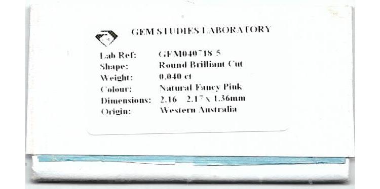 A loose round brilliant cut Argyle Origin pink Natural Diamond of 0.04ct (With GSL Memo graded as Fancy Natural Pink #GEM040718-5. Origin: Western Australian) (As new)