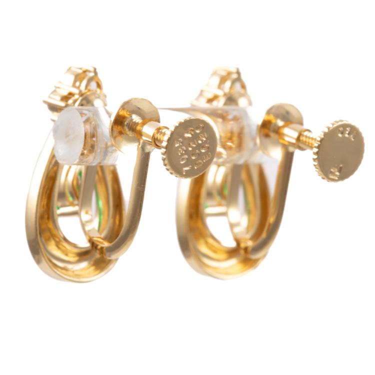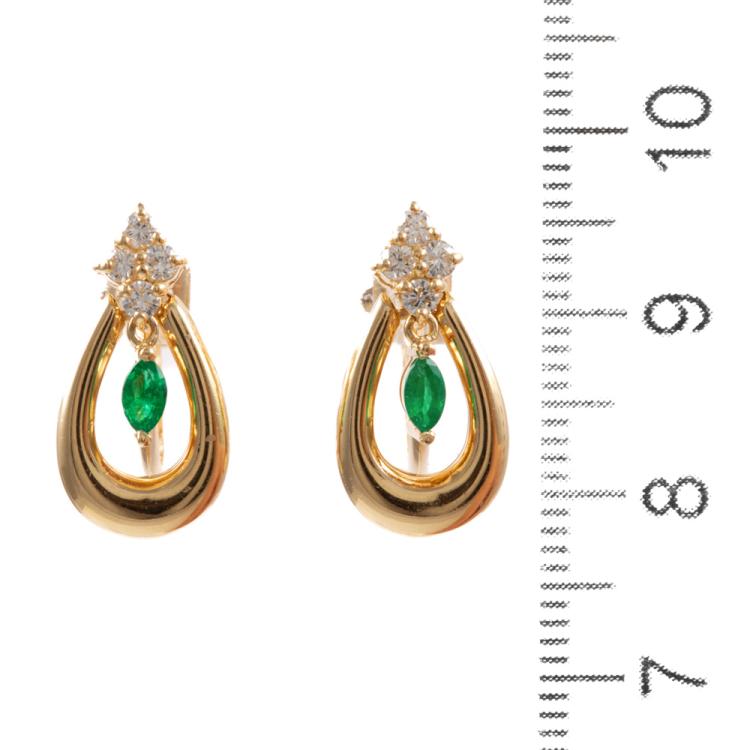 Emerald and Diamond clip-on on earrings with 2 marquise cut Natural Emeralds totalling 0.20ct and 8 round Natural Diamonds totalling 0.24ct (Estimated grading: H SI) 18ct yellow gold. Weight: 6.4g. (Pre-owned)