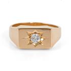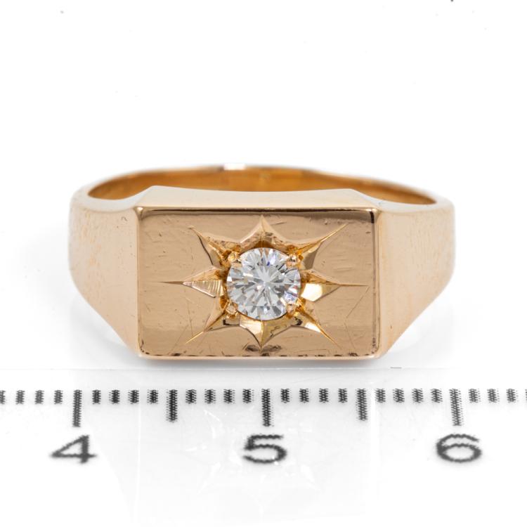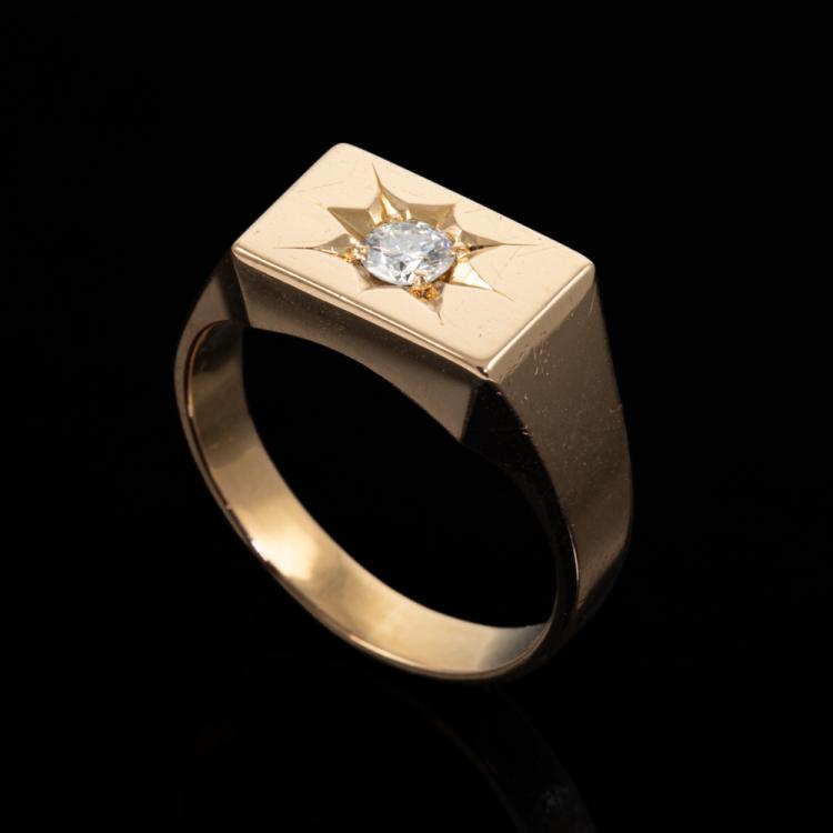 Diamond mens ring with a round natural Diamond of 0.25ct (Estimated grading: G VS). 18ct yellow gold. Ring size R. Band width: 3.5-8.6mm. Weight: 11.2g. (Pre-owned)