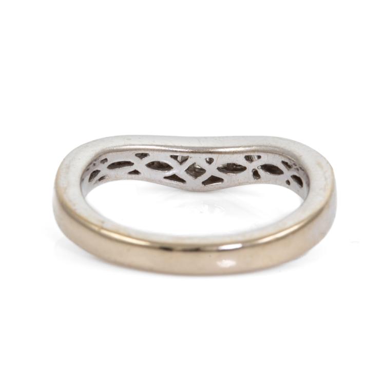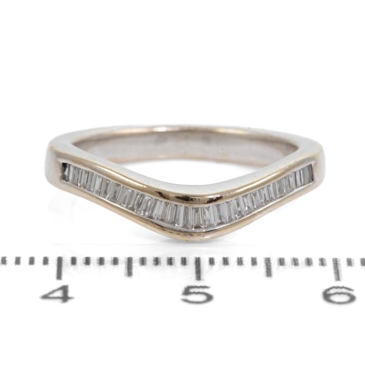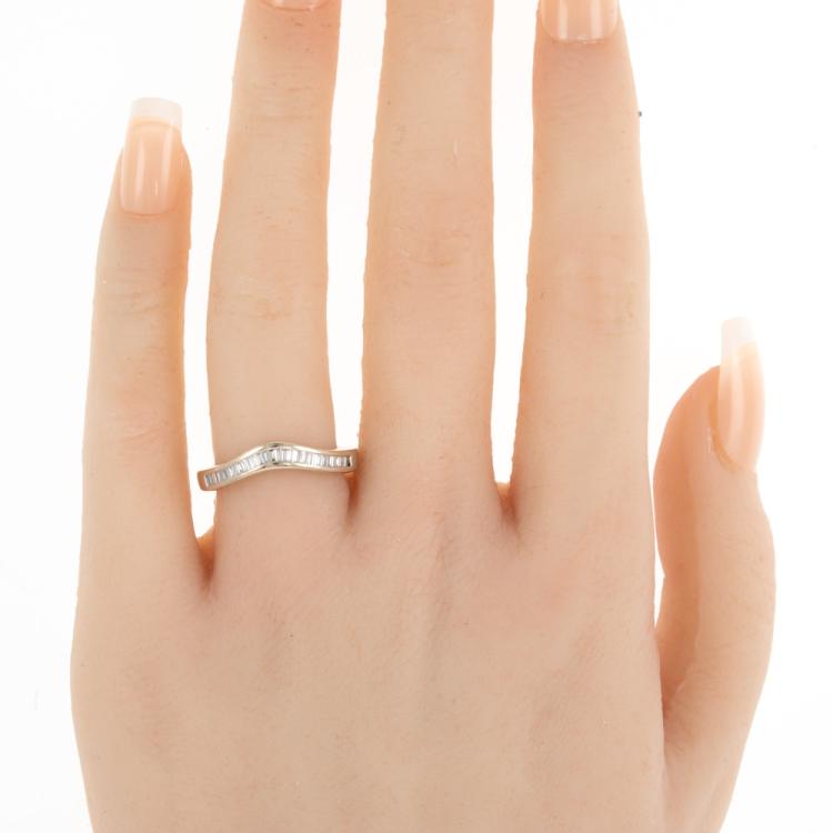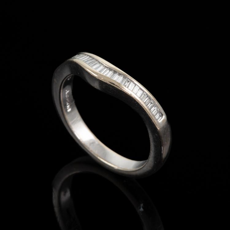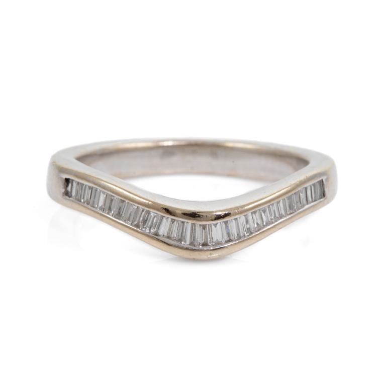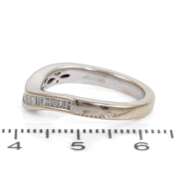 Diamond eternity ring with baguette cut Natural Diamonds totalling 0.28cts. 18ct white gold. Note rhodium plating faded. Ring size M. Band width: 2.7mm - 3.2mm. Stamped "Jobson". Weight: 4.9g. (Pre-owned)