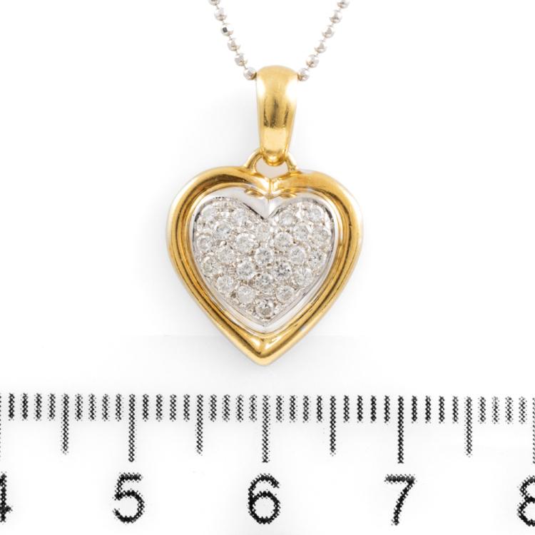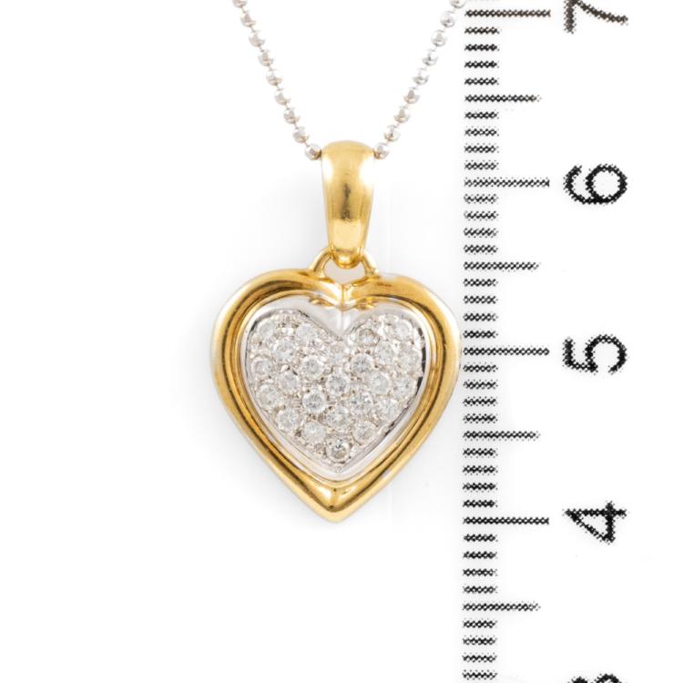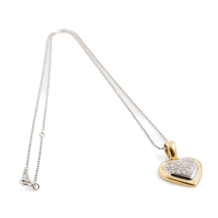Heart design pendant with round natural Diamonds totalling approximately 0.30cts (Estimated grading: H SI). 18ct yellow and white gold with 18ct white gold 39cm chain Weight: 4.8g. (Pre-owned)