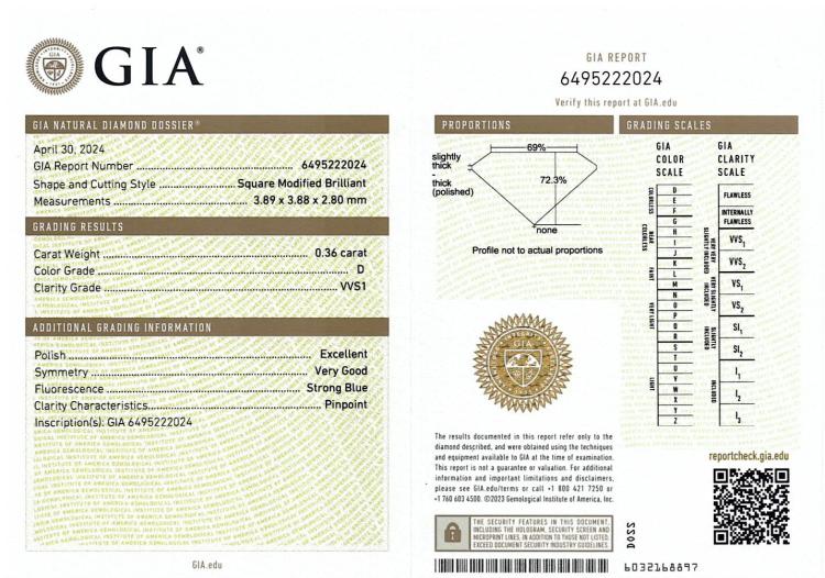 A loose princess cut Natural Diamond of 0.36ct (with GIA summary report graded as D VVS1# 6495222024). (New)