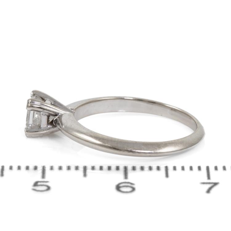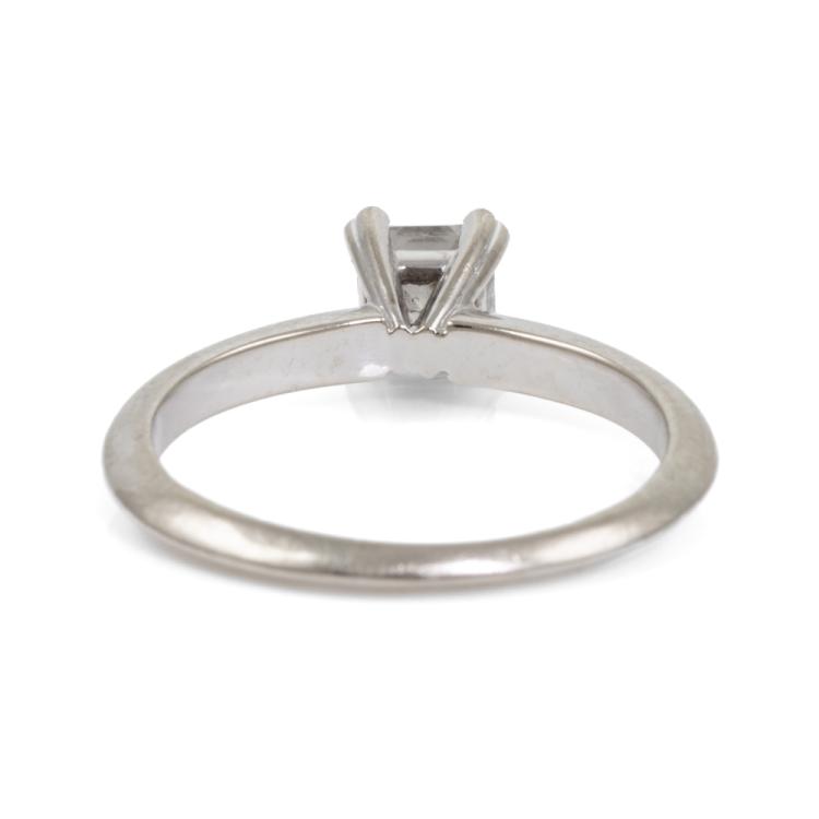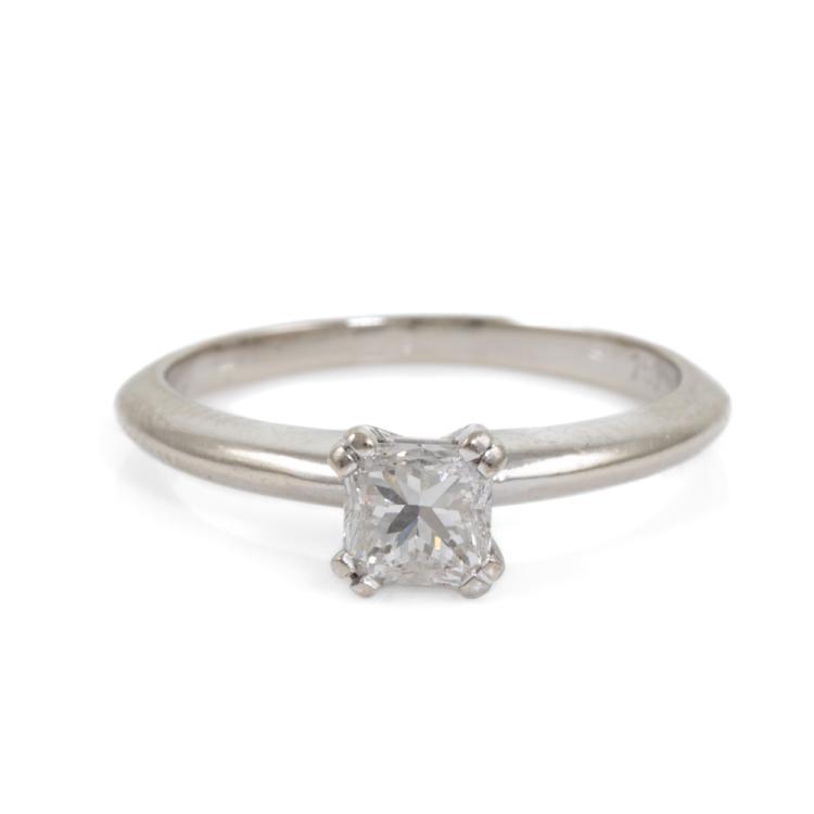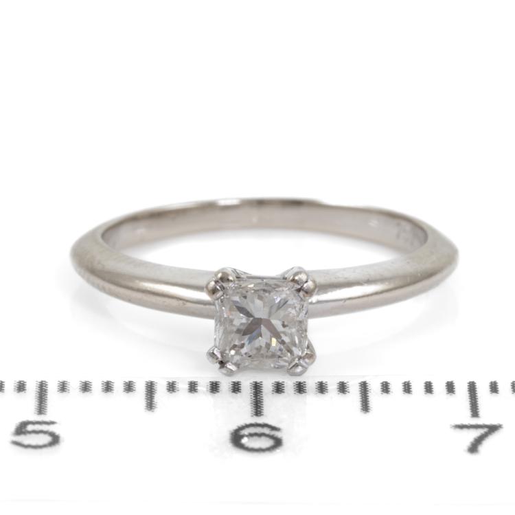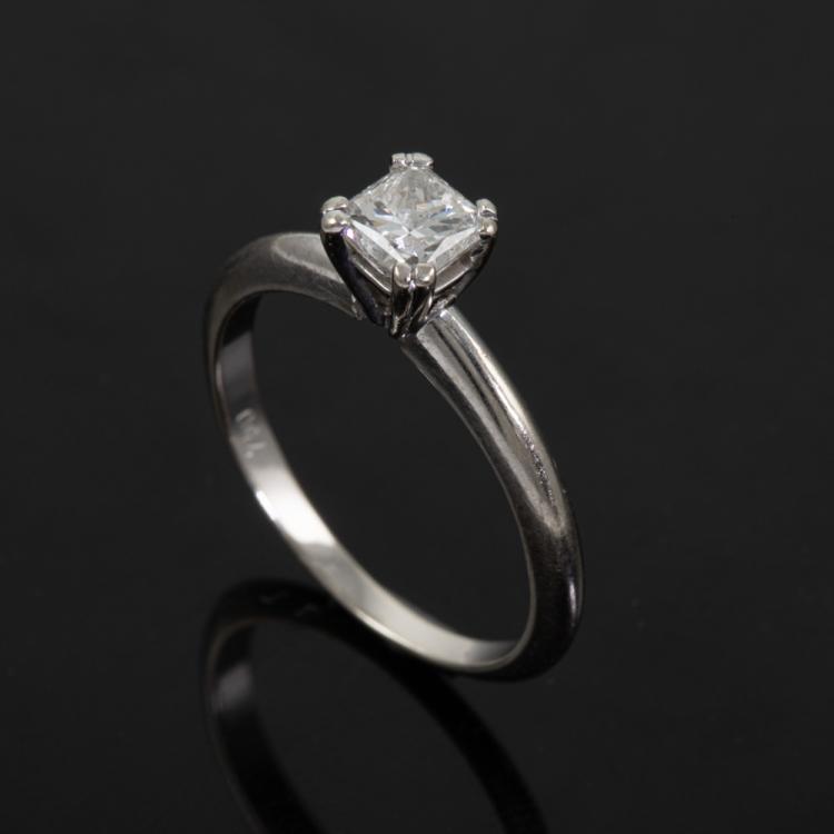 Diamond solitaire ring with princess cut Diamond of approximately 0.40cts (Estimated grading: F-G VS). 18ct white gold. Ring size I. Band width: 1.5mm 2.1mm. Weight 2.4g. (Pre-owned)