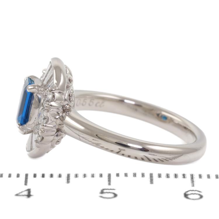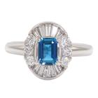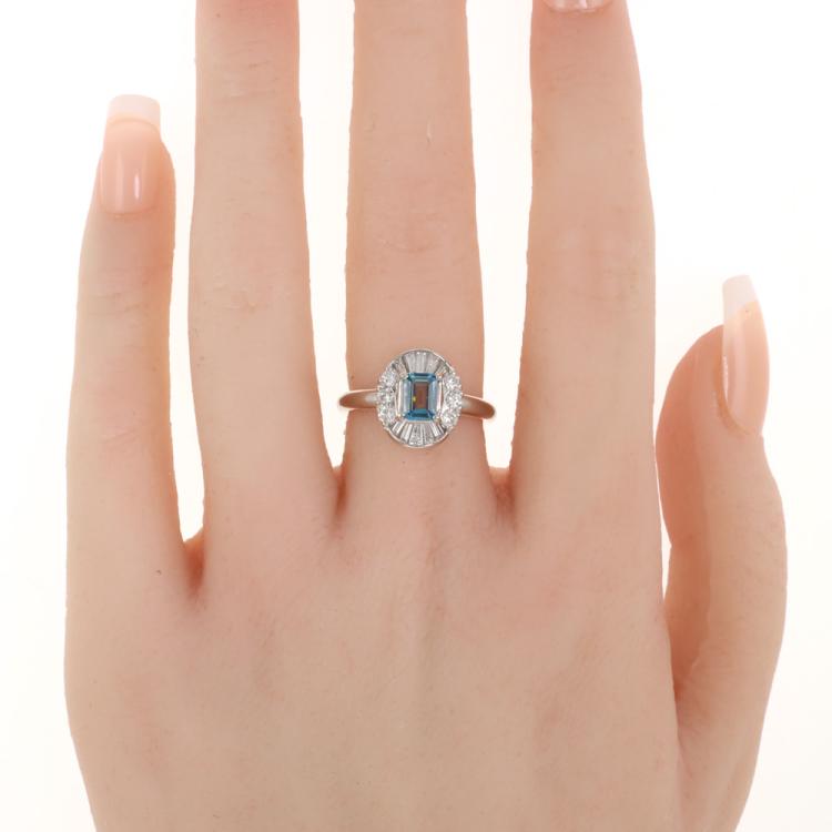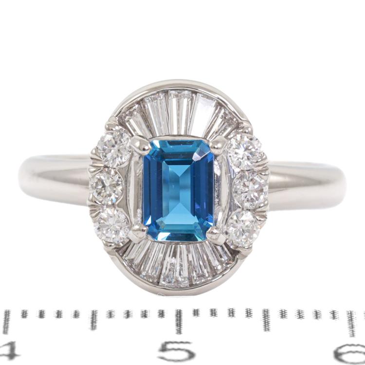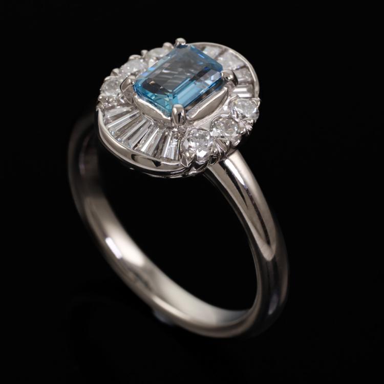 Aquamarine and Diamond ring with emerald cut Natural Aquamarine of 0.43ct with round & baguette cut Natural Diamonds totalling 0.55ct (Estimated Grading: G SI). Platinum - 900. Ring size: K1/2. Band width: 2.6mm. Weight: 7.8g. (Pre-owned)