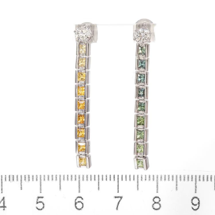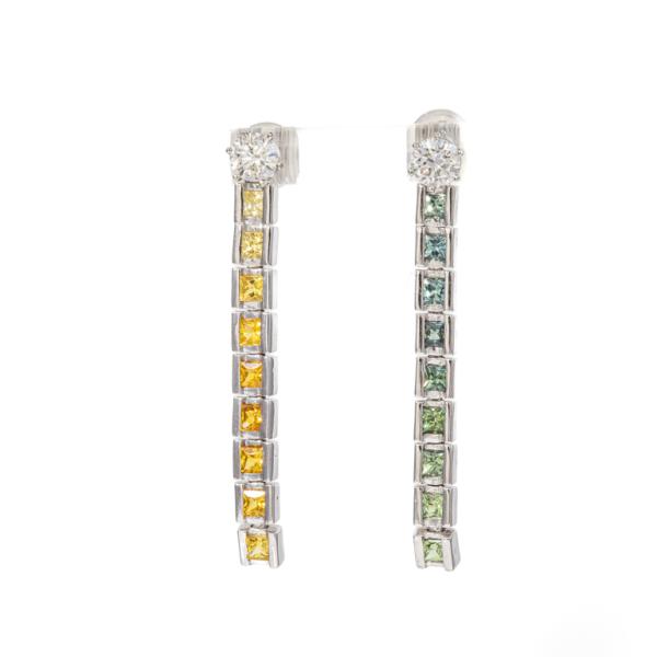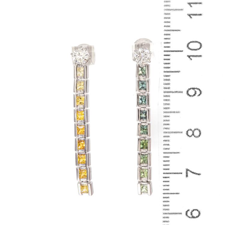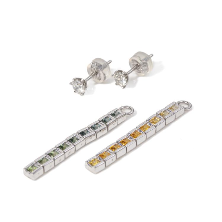 Diamond stud earrings with 2 round brilliant cut Natural Diamonds totalling 0.50cts (Estimated grading: H-I SI). Platinum 900 (studs & detachable sapphire pieces) & 14ct white gold and silicon backings, together with detachable multicolour princess sapphires totalling approximately 1.00ct. Weight: 6.3g. (New)