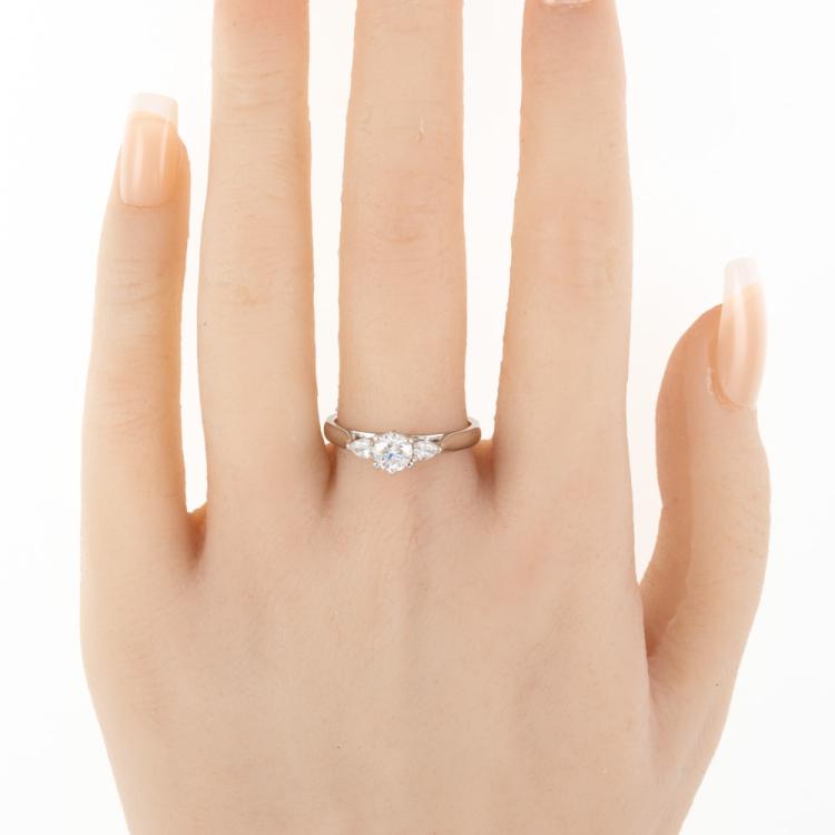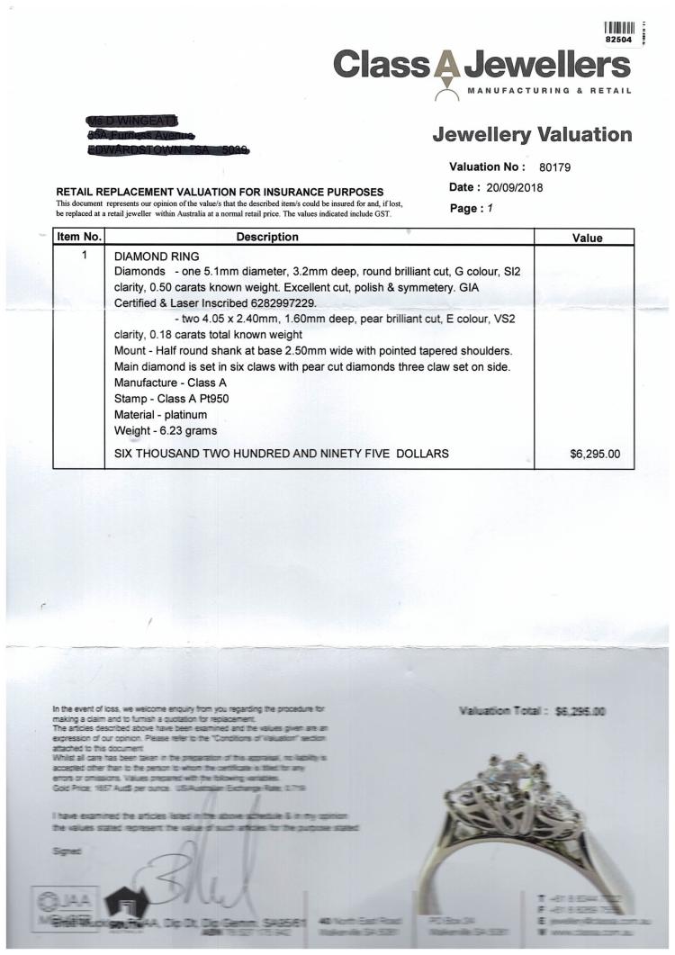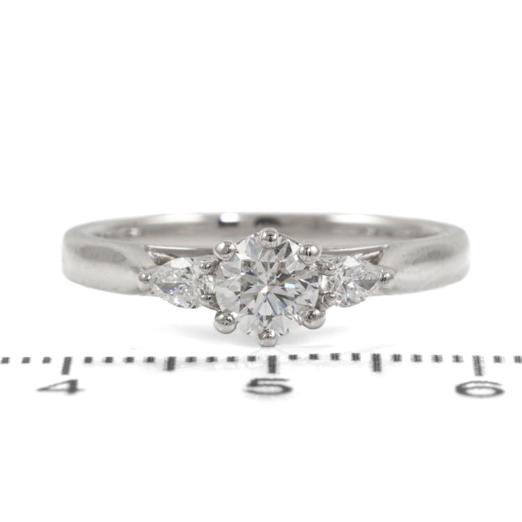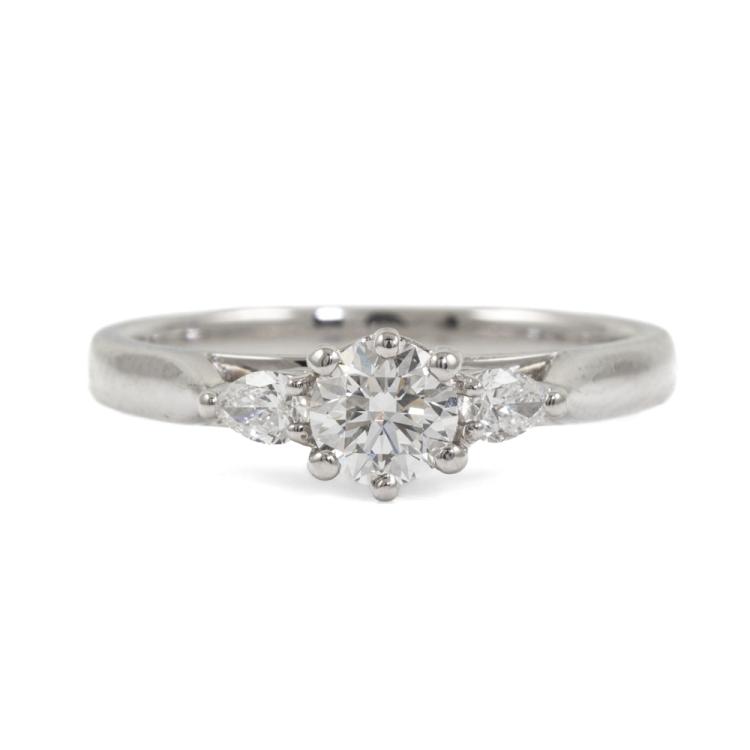 Diamond trilogy ring with a centre round brilliant cut natural Diamond of 0.50ct ( with GIA Report #6282997229 graded as G SI2) and two shoulder pear shape natural Diamonds totalling approximately 0.18ct. Platinum 950. Ring size P. Band width: 2.5mm. Weight: 6.1g. With Valuation Certificate #80179. (Pre-owned)