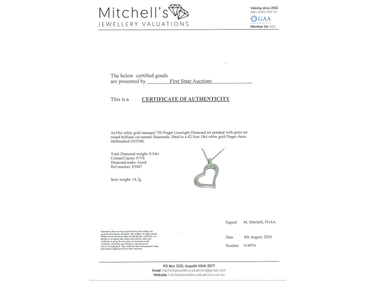 Piaget Limelight Diamond Pendant with round Natural Diamonds totalling 0.54ct (Estimated grading: F VS). 18ct white gold with 42.5cm Piaget 18ct white gold chain. Weight: 14.2g. With Certificate# 418976. (Pre-owned)