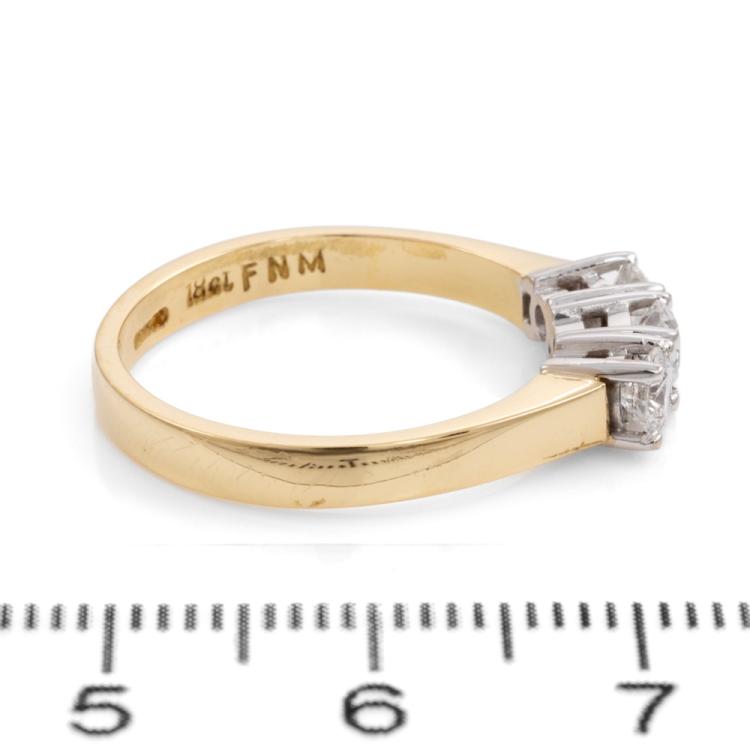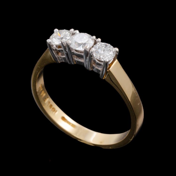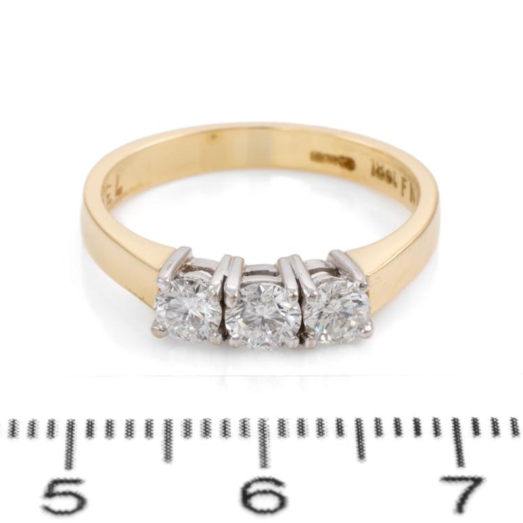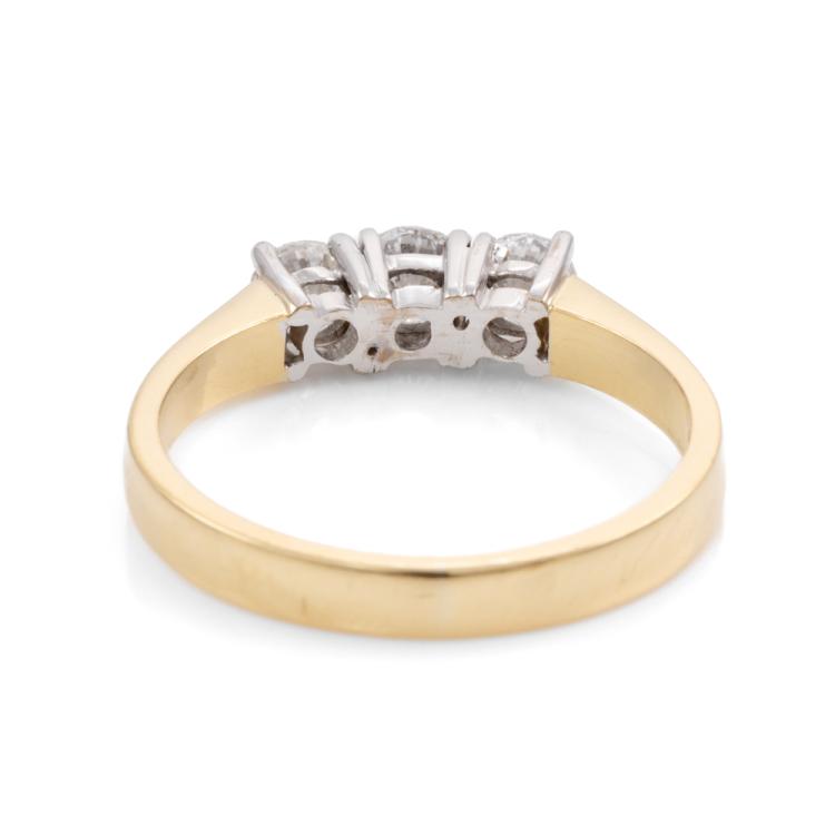 Diamond trilogy ring with round Natural Diamonds totalling approx. 0.60cts (Estimated grading: G & I VS-SI). 18ct yellow gold. Ring size O. Band width: 2.6mm. Weight: 3.9g. Engraved with: FMN 7329. (Pre-owned)