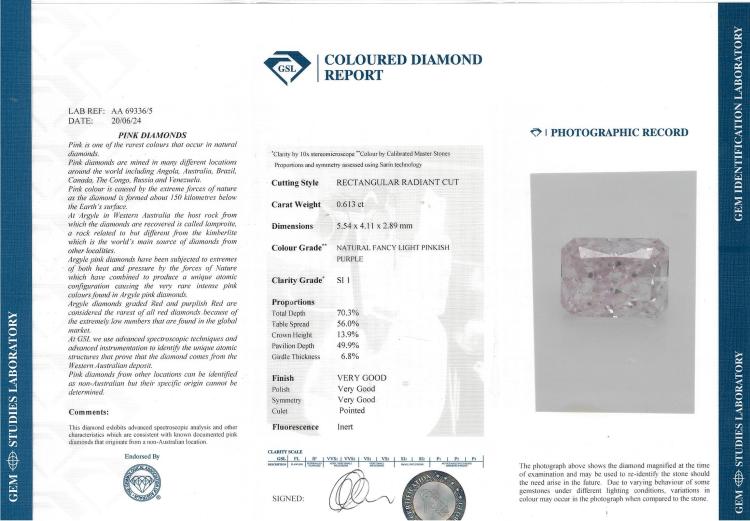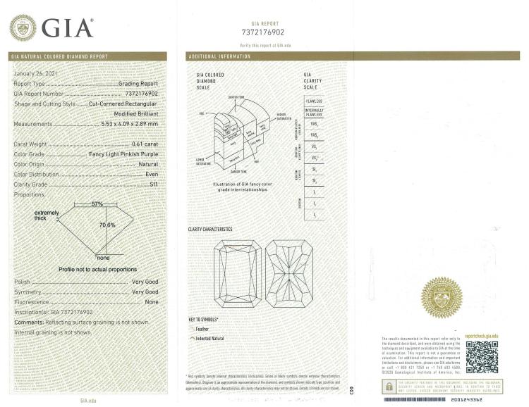 A loose radiant cut Diamond of 0.61ct (with GIA Report graded as Natural Fancy Light Pinkish Purple Even SI1 #7372176902 and GSL Report graded as Natural Fancy Light Pinkish Purple SI1 #AA69336/5). (As New)
