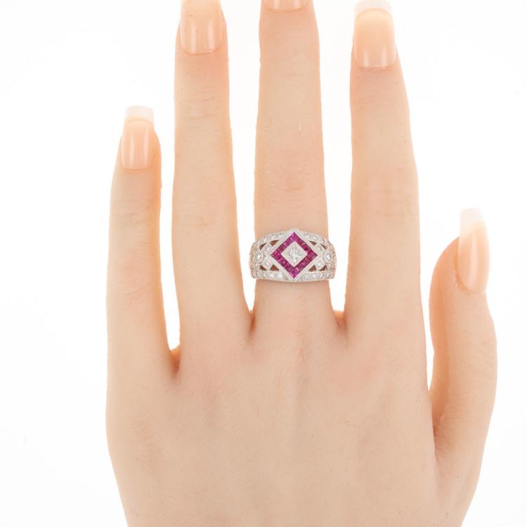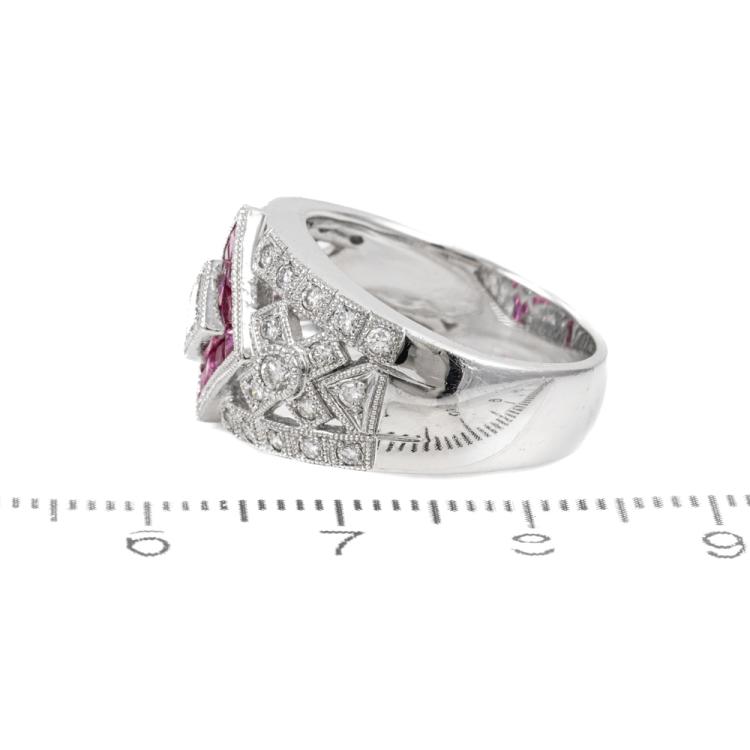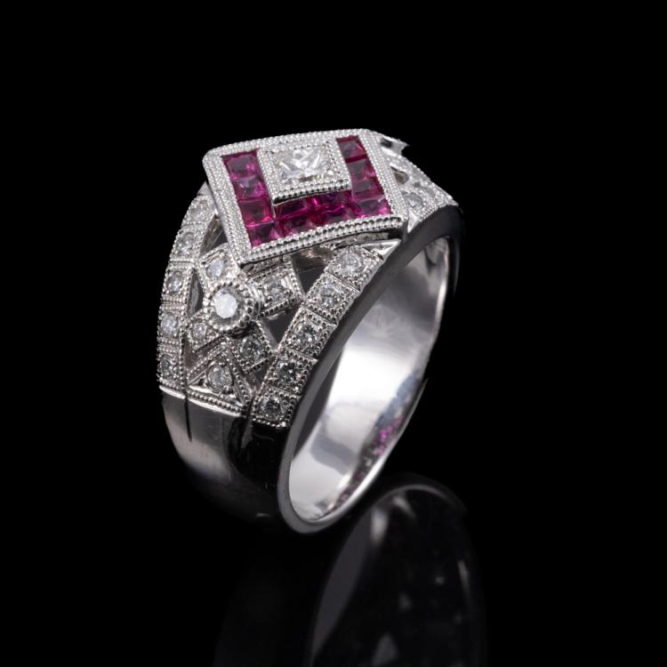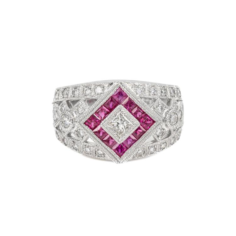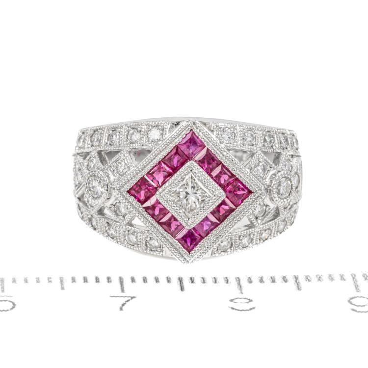 Ruby and Diamond ring with princess cut Natural Rubies totalling 0.62cts and round & princess cut Natural Diamonds totalling 0.58cts (Estimated grading: G VS-SI). Platinum 900. Ring size L. Band width: 5mm - 8.3mm. Weight: 13.7g. (Pre-owned)