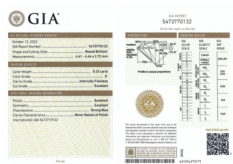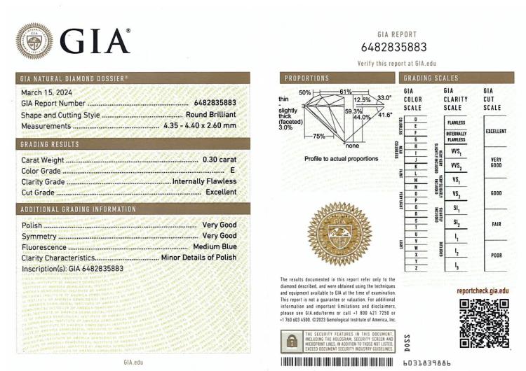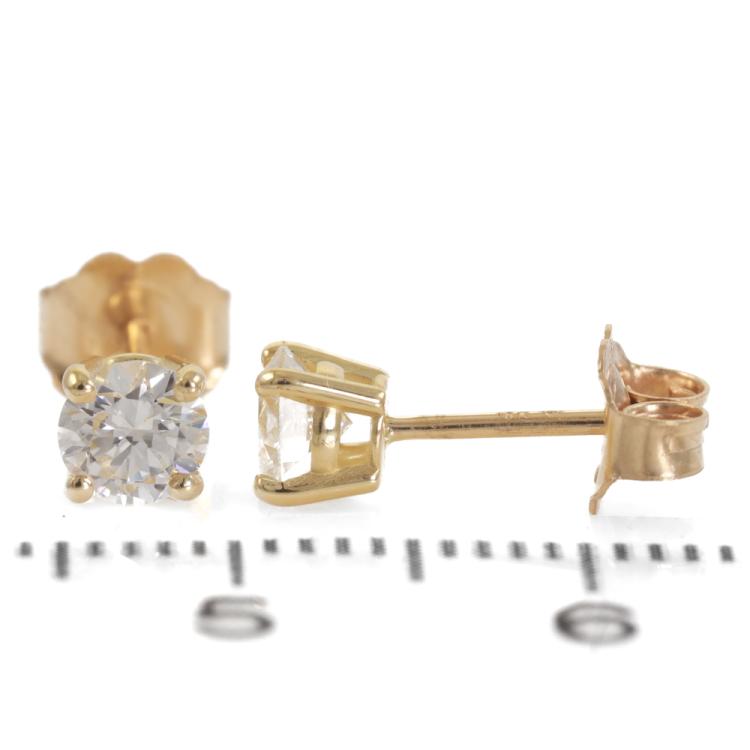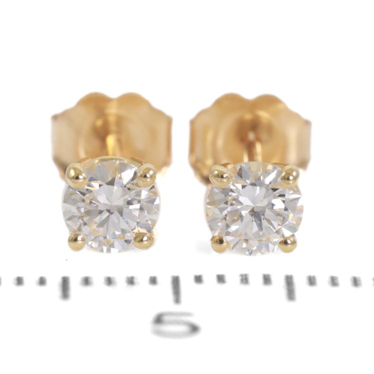 Diamond stud earrings with 2 round brilliant cut natural Diamonds totalling 0.63ct (with GIA Summary Reports graded as D Internally Flawless #5473770132 & E Internally Flawless #6482835883). 18ct yellow gold. Weight: 0.9g. (New)