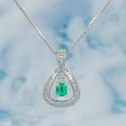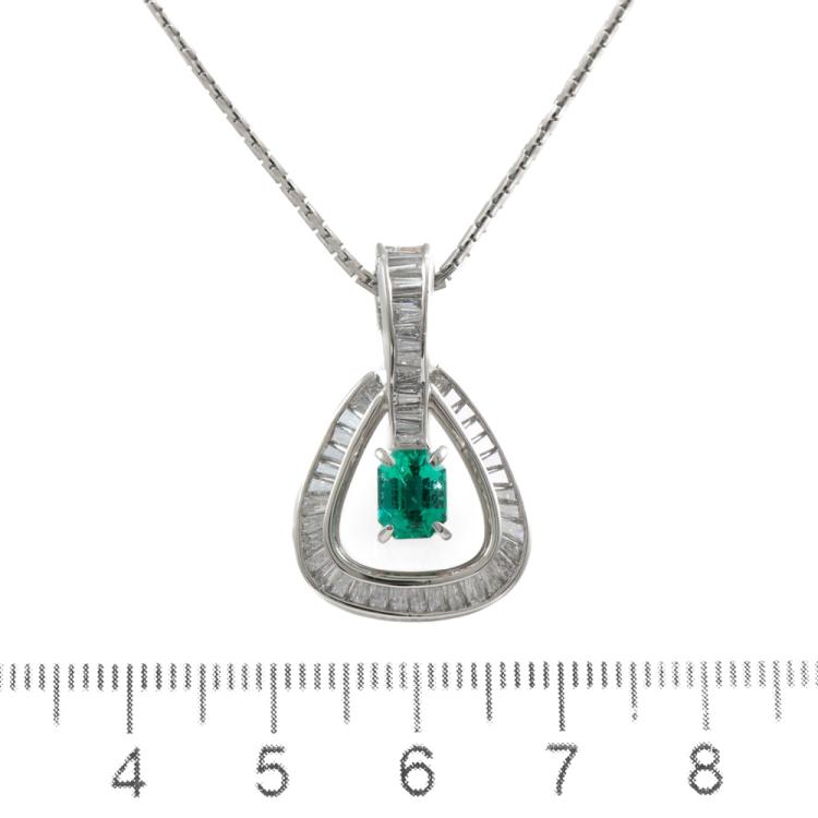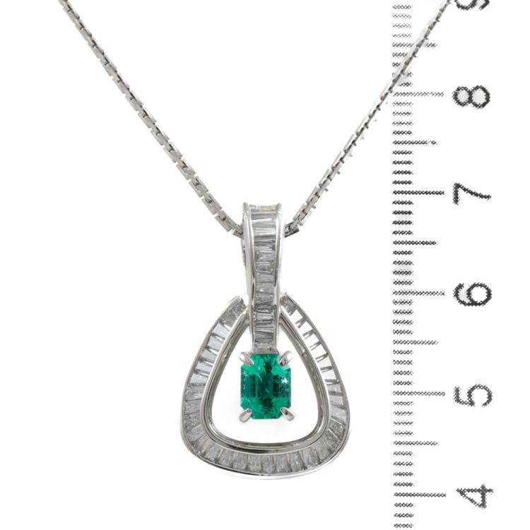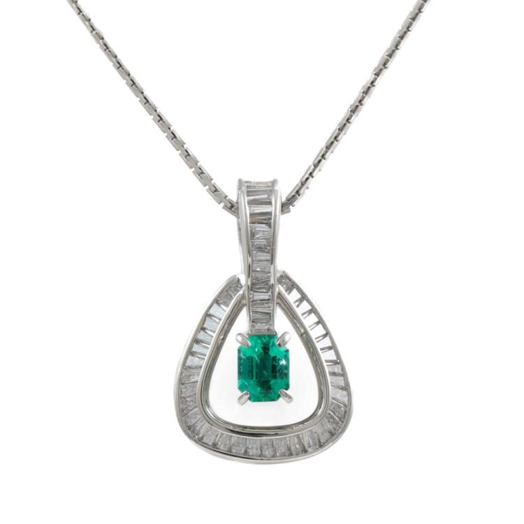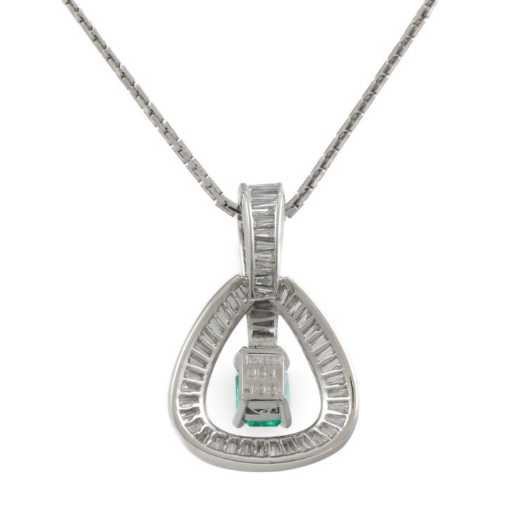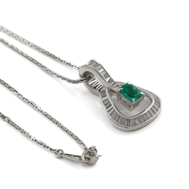 Emerald and Diamond pendant with emerald cut Natural Emerald of 0.64ct and round Natural Diamonds totalling 1.98ct (Estimated grading: H SI). Platinum - 900 with 40cm platinum 850 chain. Weight: 10.7g. (Pre-owned)