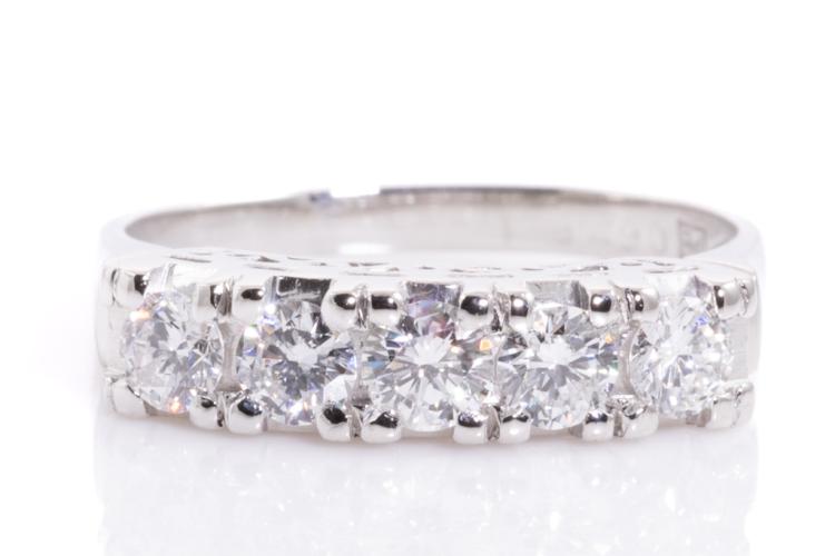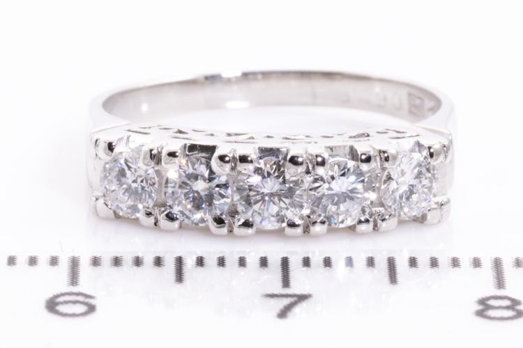 Diamond eternity ring with 5 round Natural Diamonds totalling 0.67cts (Estimated grading: G SI). Platinum 900. Ring size M. Weight: 4.9g. (Pre-owned)