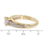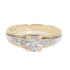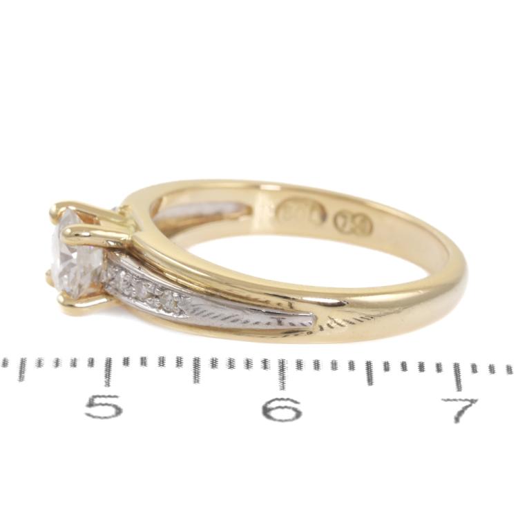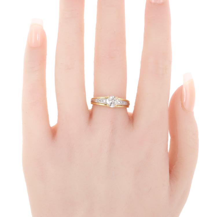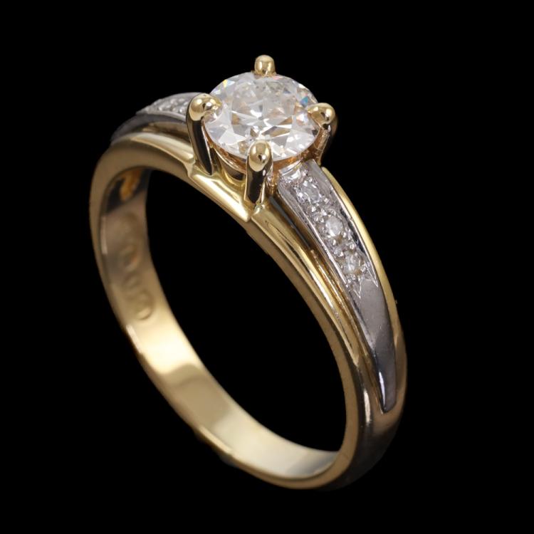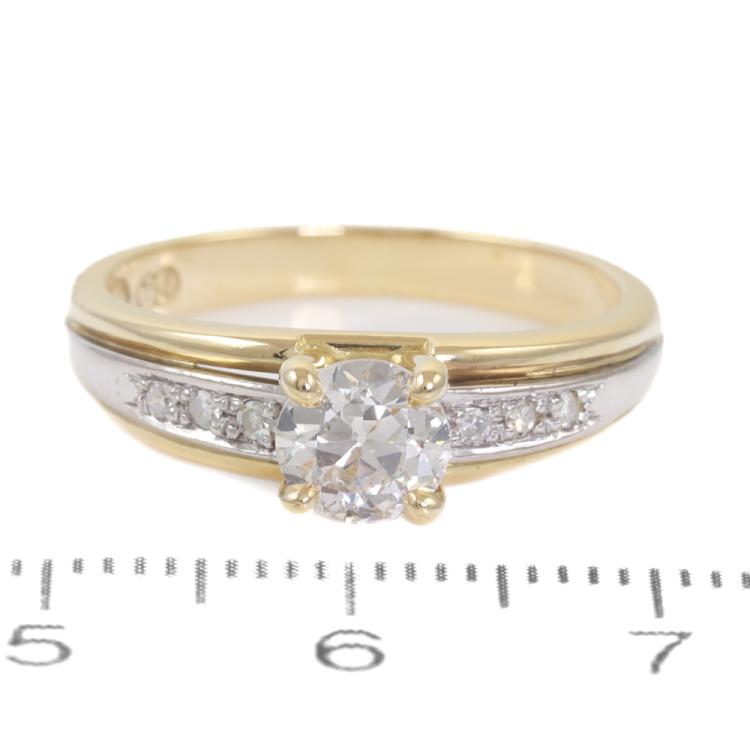 Diamond solitaire ring with centre round brilliant cut natural Diamond of approximately 0.70ct (Estimated grading: H SI) and 6 round single cut natural Diamonds totalling approximately 0.06ct. 18ct yellow and white gold. Ring size: O. Band width: 2.6mm - 3.2mm. Weight: 5.2g. (Pre-owned)