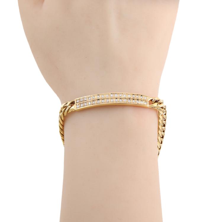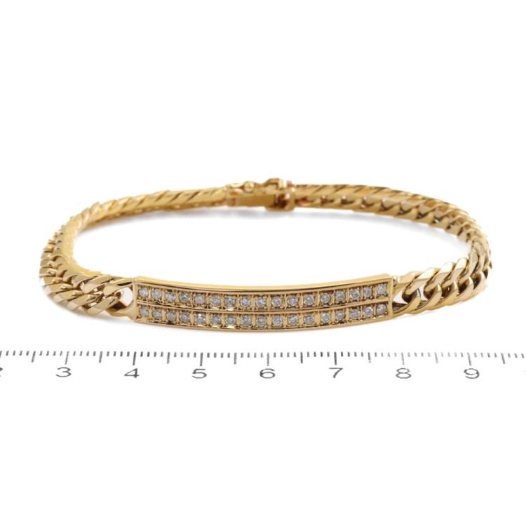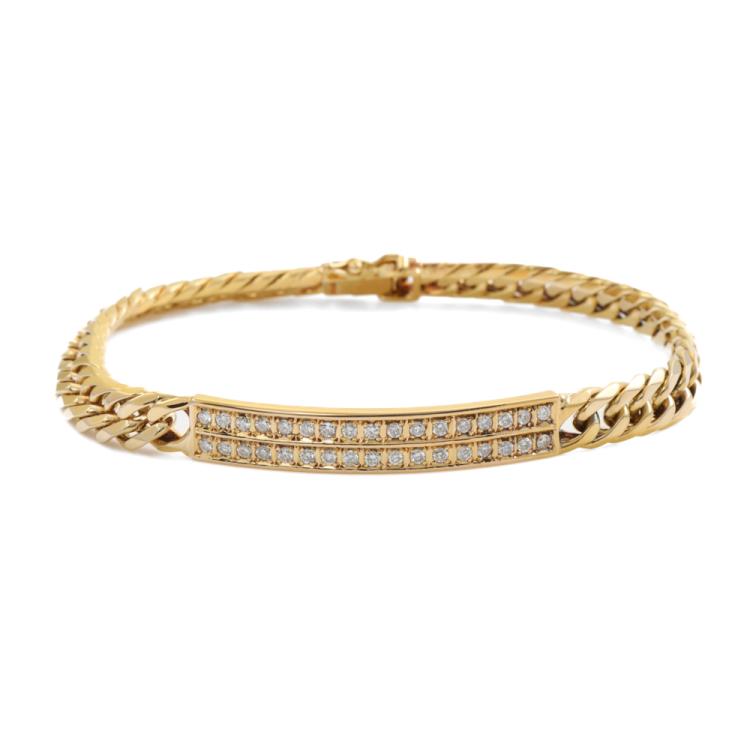 Diamond ID bracelet with round Natural Diamonds totalling 0.78ct (Estimated grading: I-J SI) set on ID plate. 18ct yellow gold. Length: 20.0cm. Weight: 30.7g. With Certificate #419197 (Pre-owned)