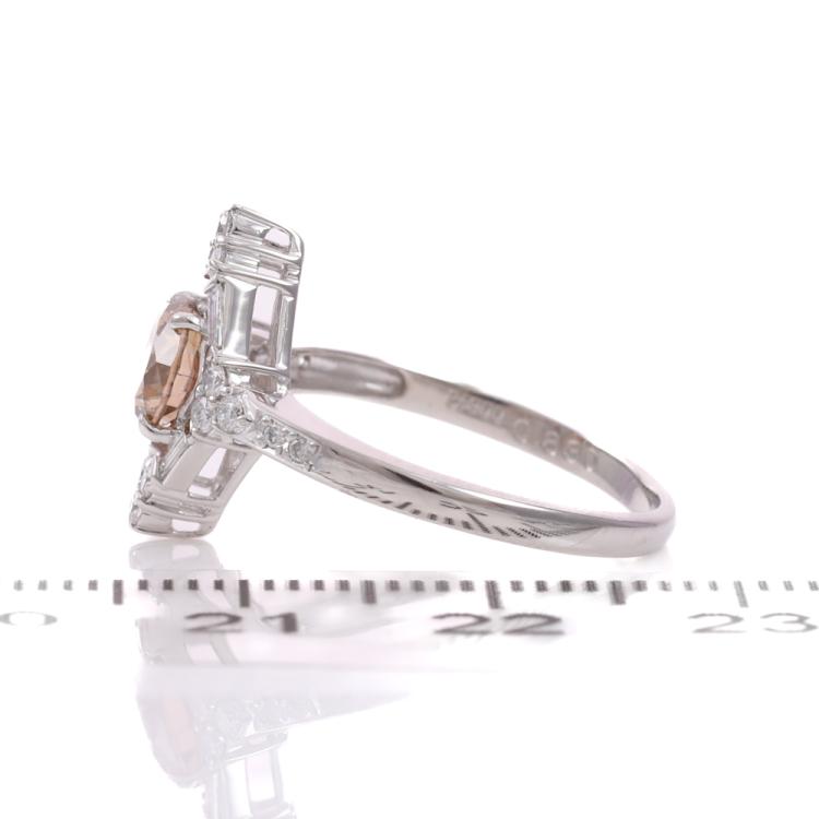 Diamond ring with centre round Natural Diamond of 0.83ct (Estimated grading: Dark Champagne SI) and surrounding round & tapered baguette cut Natural Diamonds totalling 0.25ct. Platinum 900. Ring size: L. Band Width: 1.8mm-2.1mm. Weight: 3.8g. (As new)