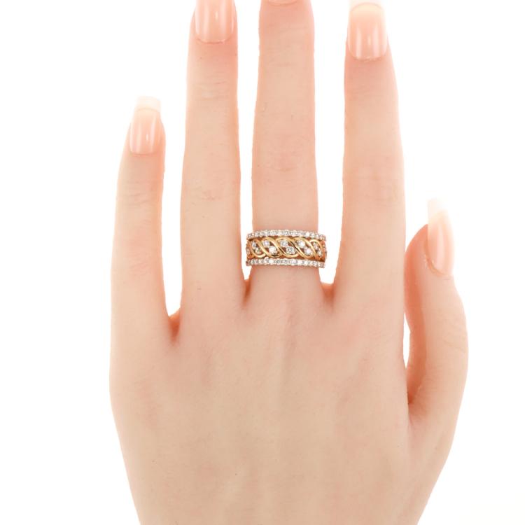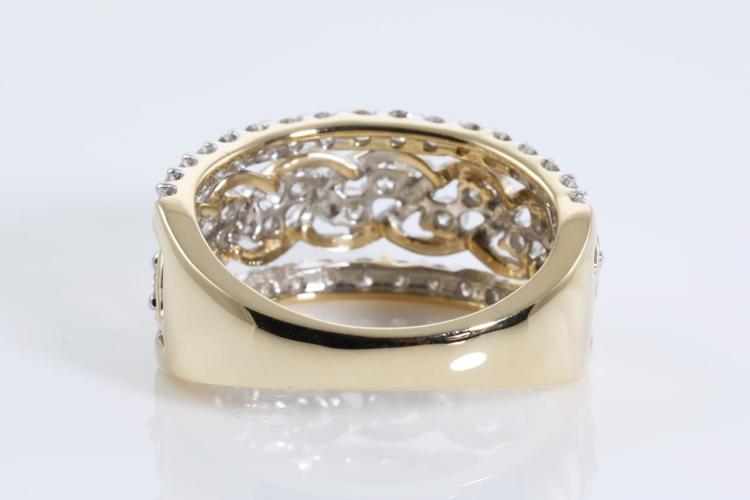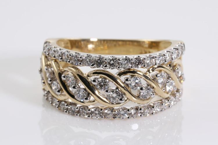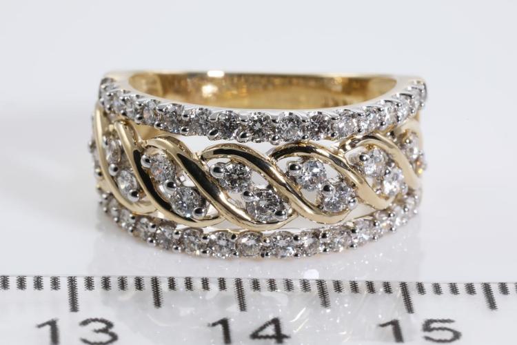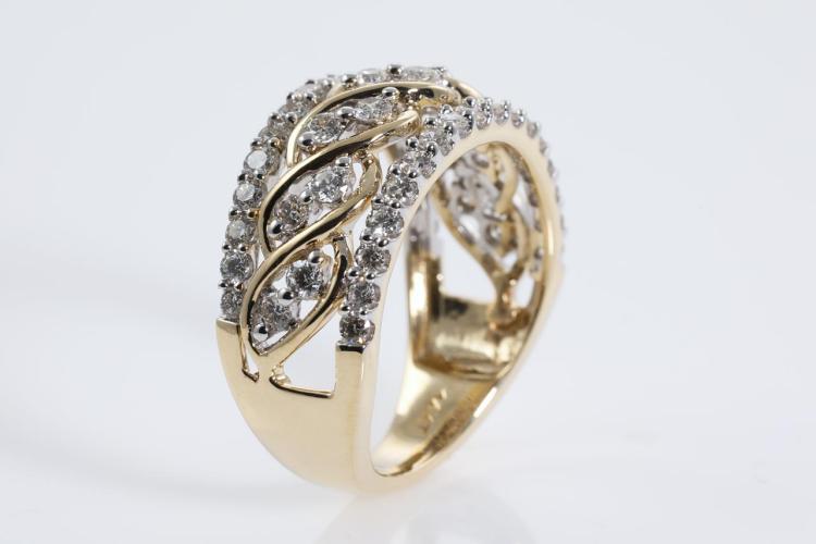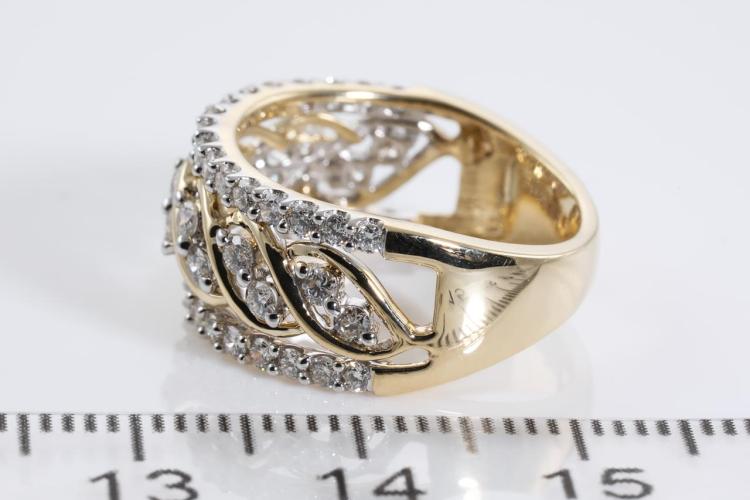 Diamond dress ring with 48 round natural Diamonds totalling 0.90ct (Estimated Grading: H SI). 14ct yellow gold. Ring size L - cannot be resized up, down with ring clip. Weight: 4.6g (New)