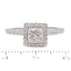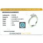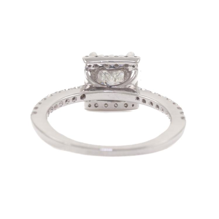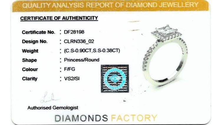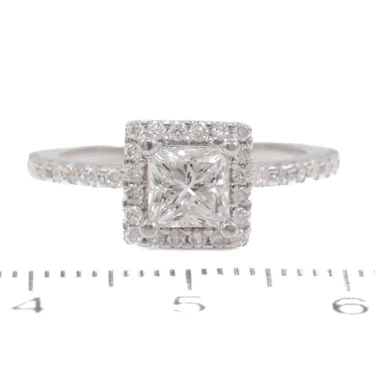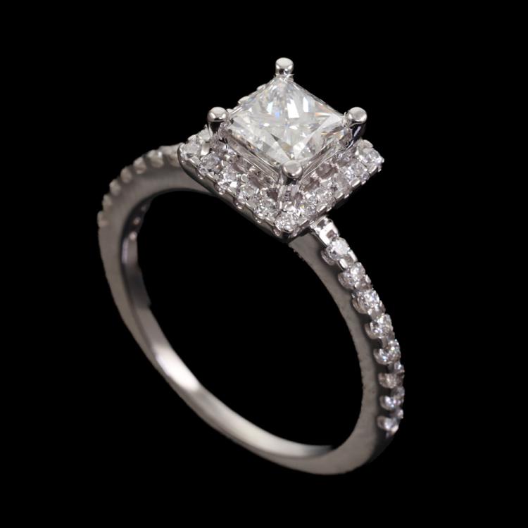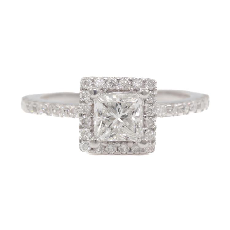 Diamond halo ring with centre princess cut Natural Diamond of 0.90ct (with GIA Diamond Dossier Report graded as F VS2 #5146549731) and surrounding round Natural Diamonds totalling 0.38ct (Estimated grading: F-G SI). 18ct white gold. Ring size L½. Width: 1.2mm - 1.4mm. Weight: 3.8g. With Certificate of Authenticity card. (Pre-owned)