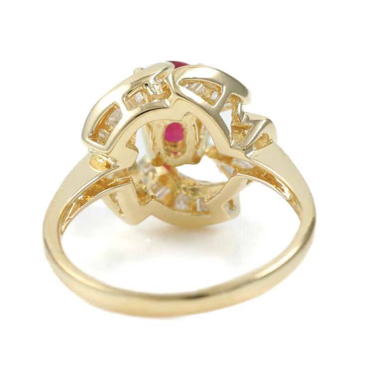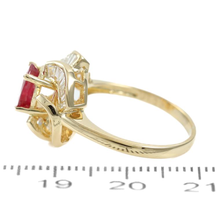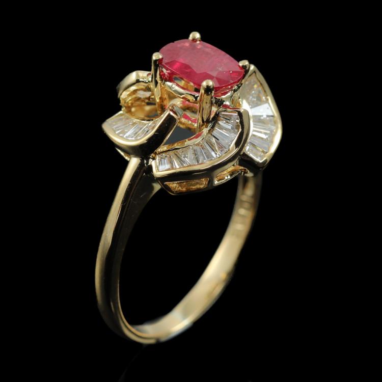 Ruby and Diamond ring with centre oval Natural Ruby of 0.95ct and surrounded by round Natural Diamonds totalling 1.05ct (Estimated grading: I-J SI-P1). 18ct yellow gold. Ring size L. Band width: 1.9mm. Weight: 4.5g. (Pre-owned)