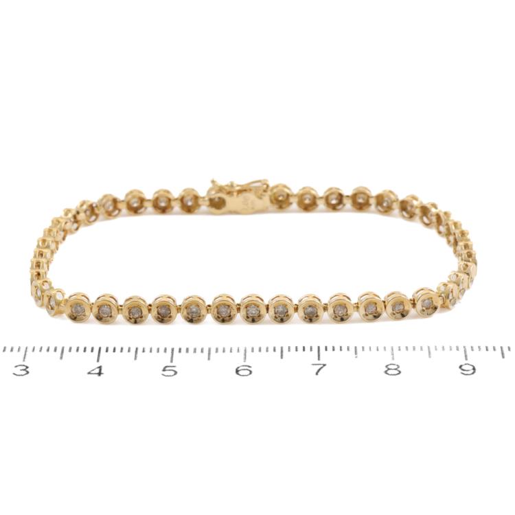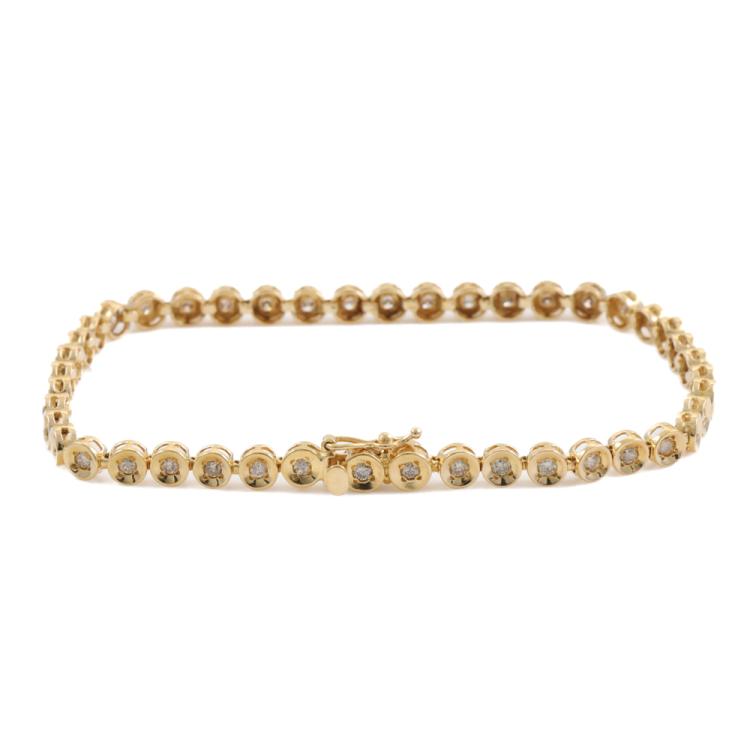 Diamond bracelet with 44 bezel set round Natural Diamonds totalling 1.00ct (Estimated grading: J-K SI-P1). 18ct yellow gold. Length: 18cm. Weight: 7.1g. (Pre-owned)