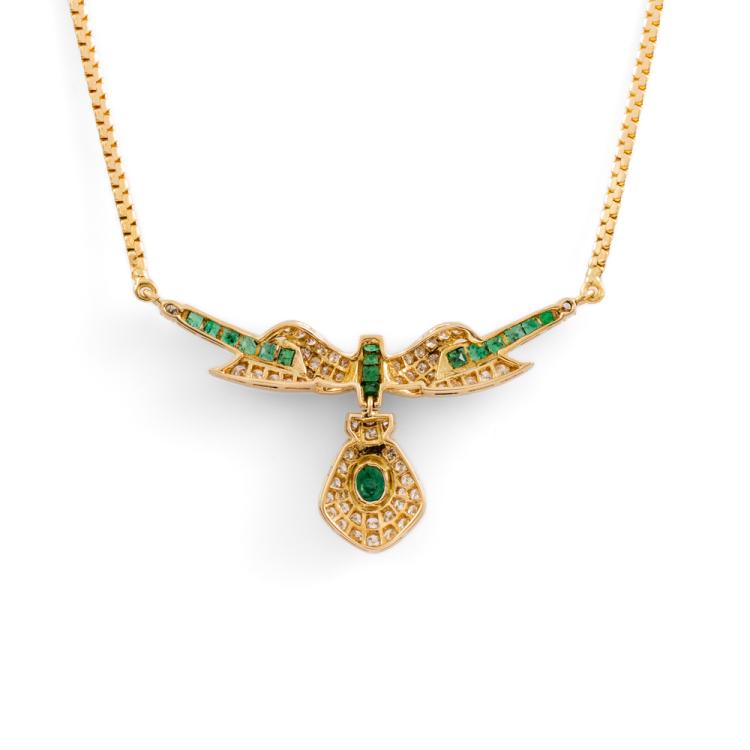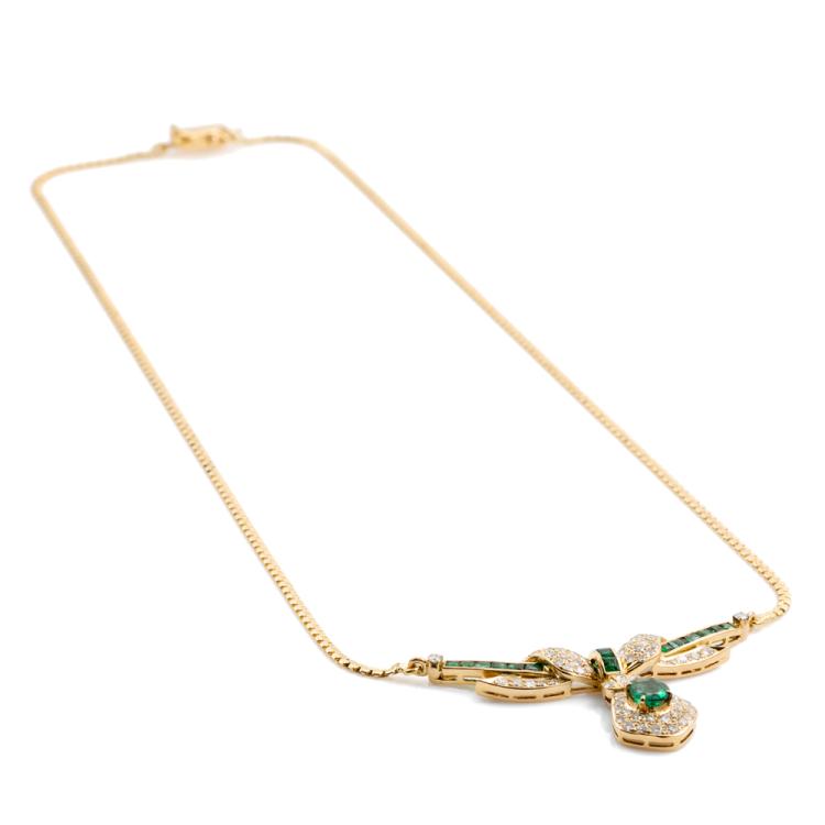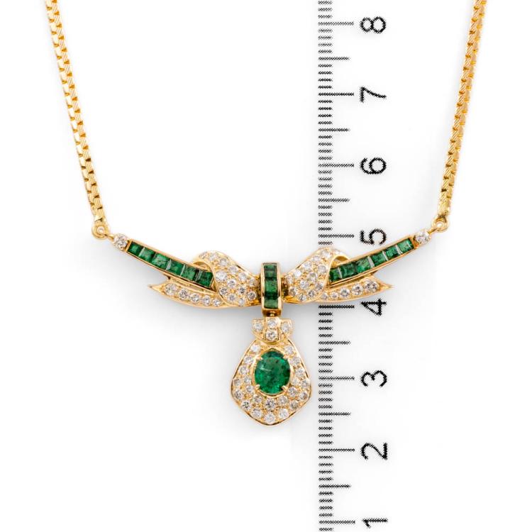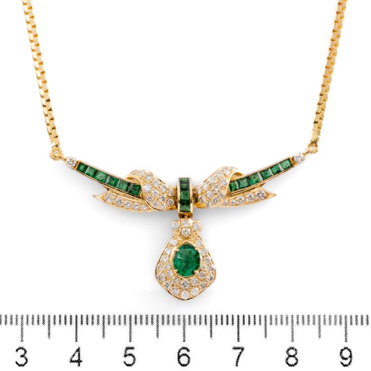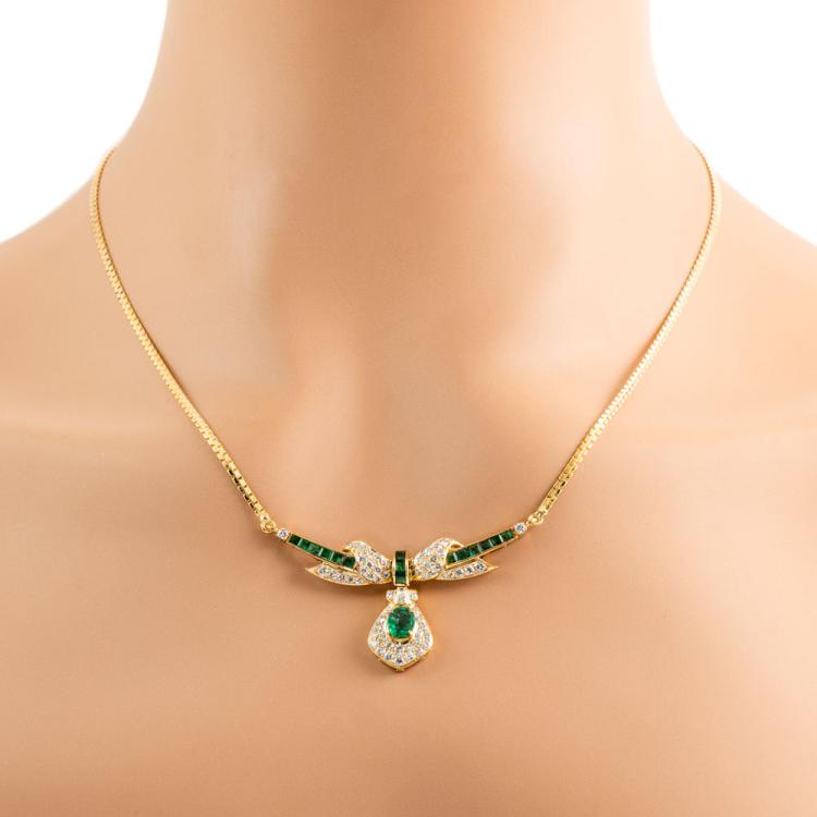 Emerald and Diamond necklace with carre cut & oval shape Natural Emeralds totalling approximately 1.00cts (note 1 stone has minor chip) and round Natural Diamonds totalling approximately 0.80cts (Estimated grading: H-J P1; 3 diamonds chipped). 18ct yellow gold. Length: 46.5cm. Weight: 12g. (Pre-owned)