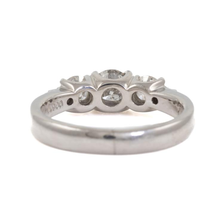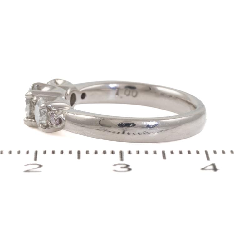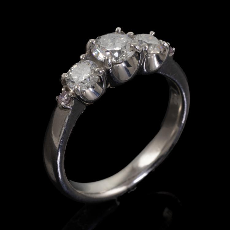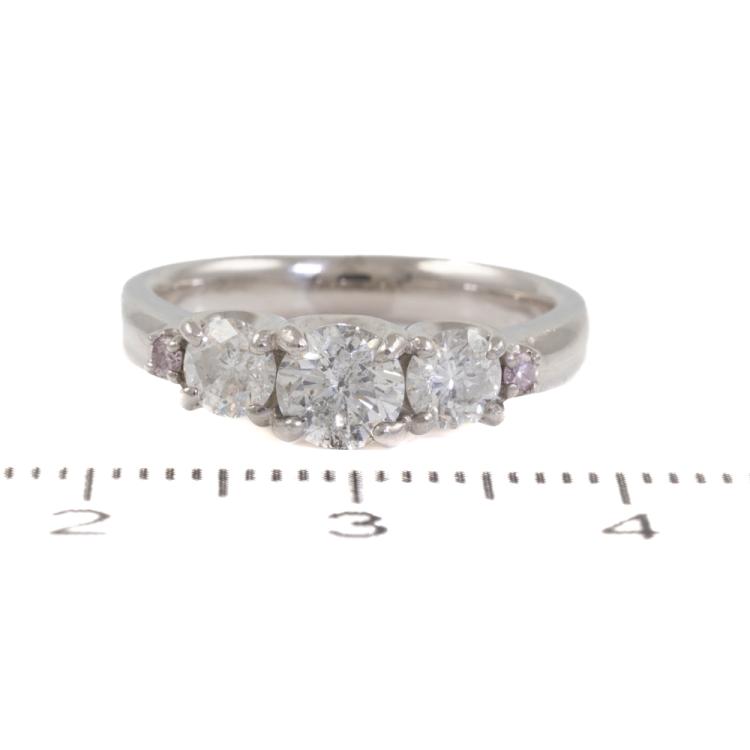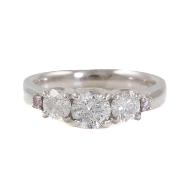 Diamond Dress ring with 3 central round Natural Diamonds (Estimated grading: G-H P2) and 2 shoulder round Natural Fancy Pink diamonds totalling 1.00ct. Platinum 900. Ring size J 3/4. Band width: 3.0mm 2.7mm. Weight: 6.3g. (Pre-owned)