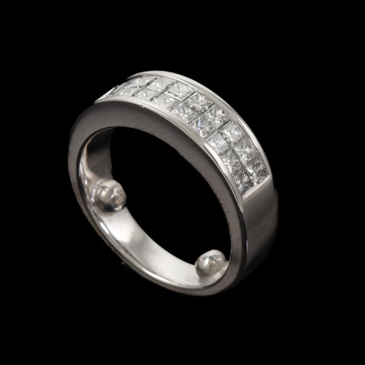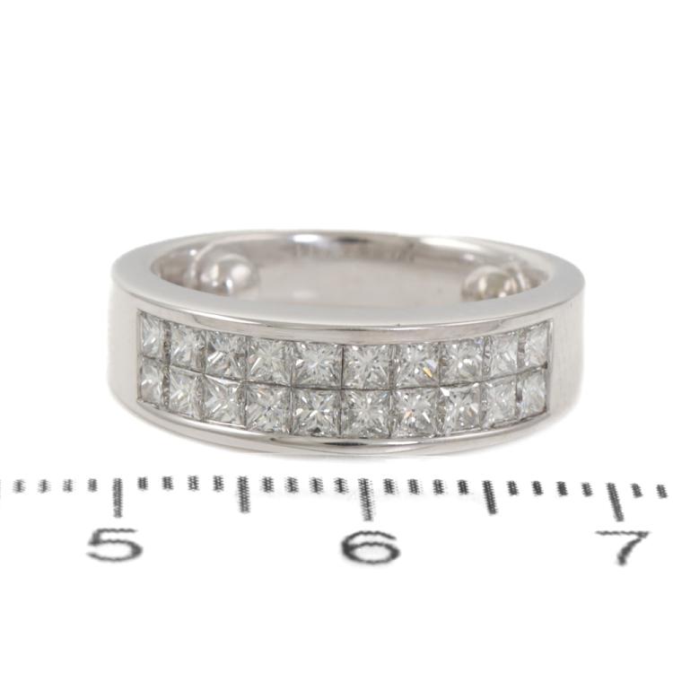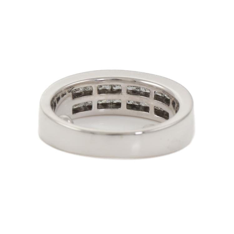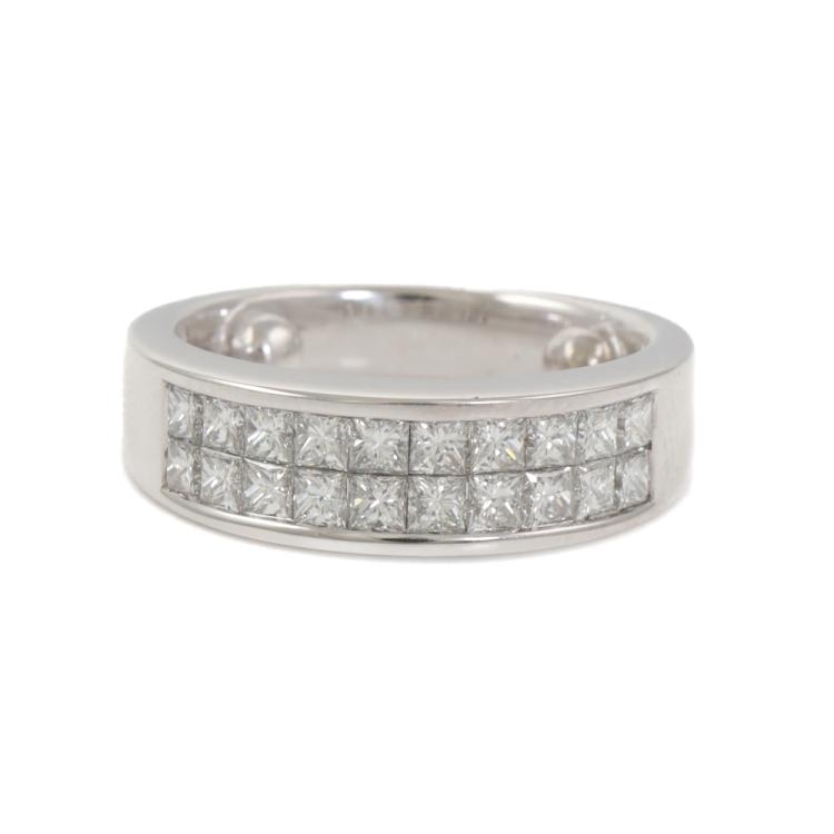 Diamond dress ring with 2 rows of princess cut Natural Diamonds totalling approximately 1.00ct (Estimated grading: H-I SI). 18ct white gold. Ring size E - 2 sizing beads present inside ring band. Band width: 3.6mm-5.3mm. Weight: 7.3g. (Pre-owned)