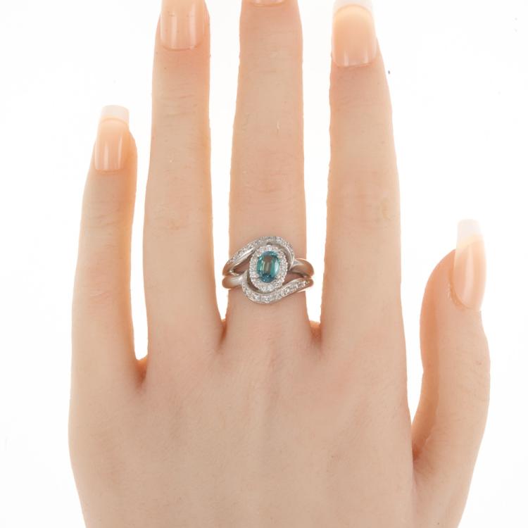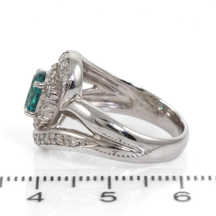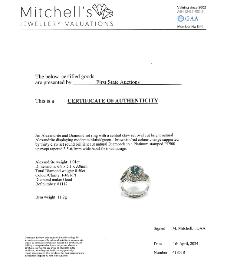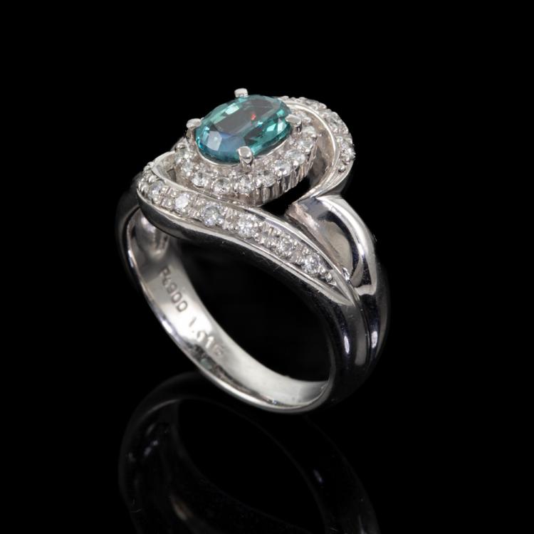 Alexandrite and Diamond ring with oval shape Natural Alexandrite (With moderate colour change blueish green to brownish red) of 1.01ct and round Natural Diamonds totalling 0.50cts (Estimated grading: I-J SI-P1). Platinum 900. Ring size M - ring resizing is not recommended. Band width: 3.5 - 6.1mm. Weight: 11.2g. With Certificate #418518. (Pre-owned)