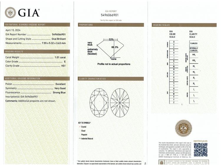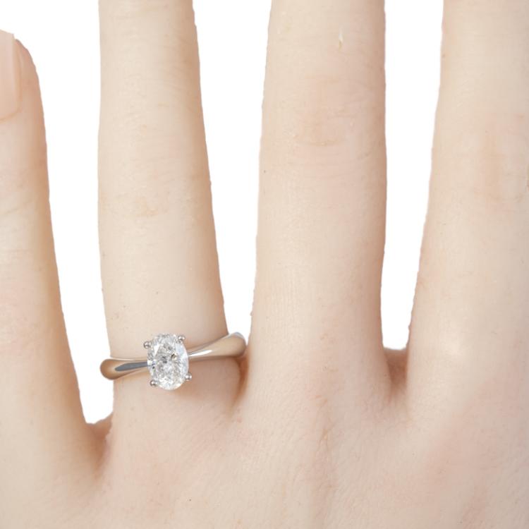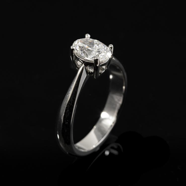 Diamond solitaire ring with oval shape Natural Diamond of 1.01ct (with GIA Report graded as E VS1 #5496066901). Platinum. Ring size K3/4. Band width: 3.2mm - 2mm. Weight 6.2g. (New)