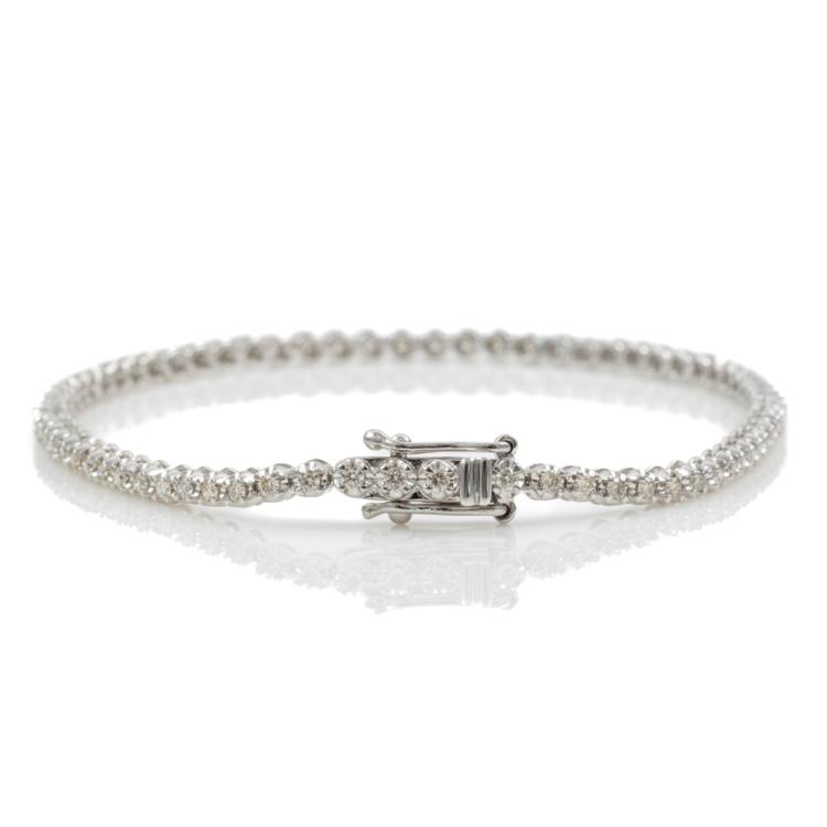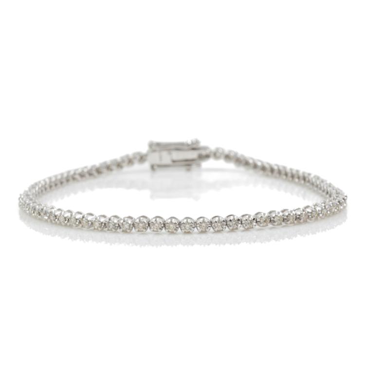 Diamond tennis bracelet with 73 round natural Diamonds totalling 1.01cts (Estimated grading: H SI). 14ct white gold. Length: 18.0cm. Weight: 6.1g. (New)