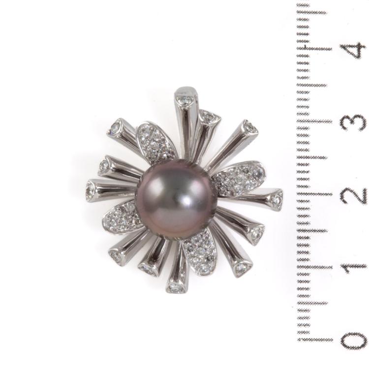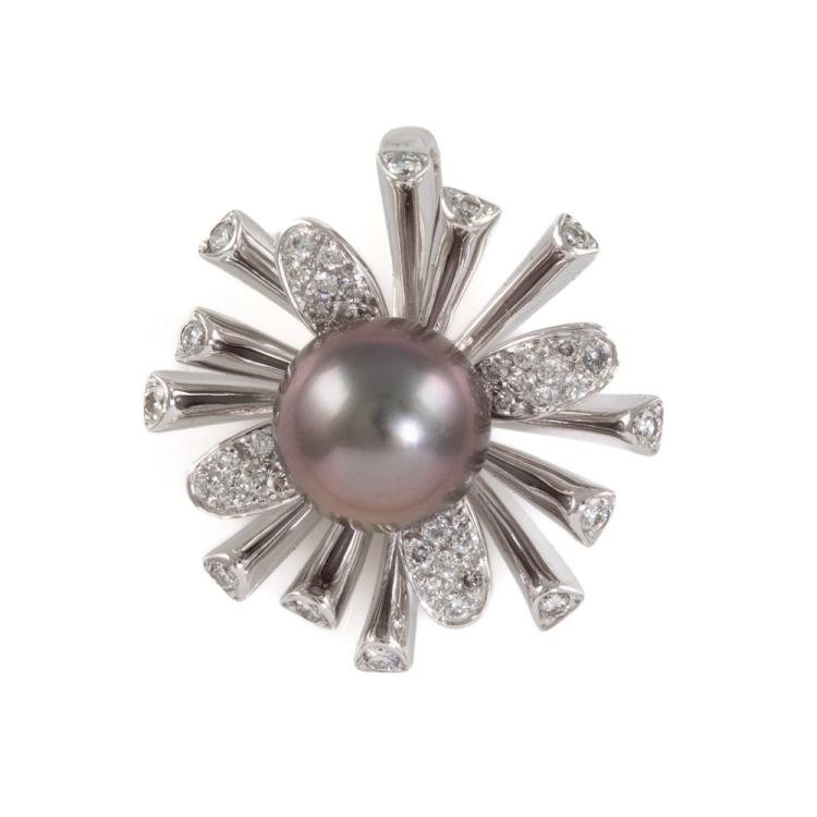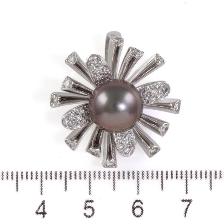 Pearl and Diamond pendant with Tahitian Pearl of 10.1mm and round Natural Diamonds totalling approximately 0.50cts (Estimated grading: G SI). 18ct white gold (XRF tested, not stamped). Weight: 13.1g. Dimension: 24.7mm x 26.5mm. No chain provided. (Pre-owned)
