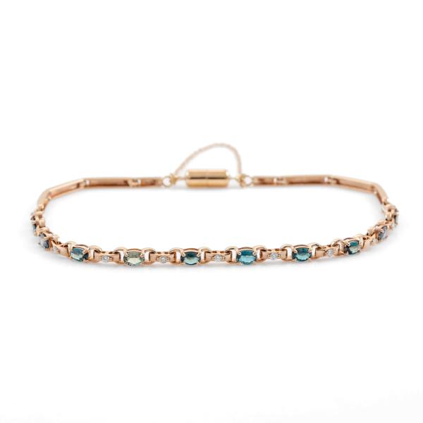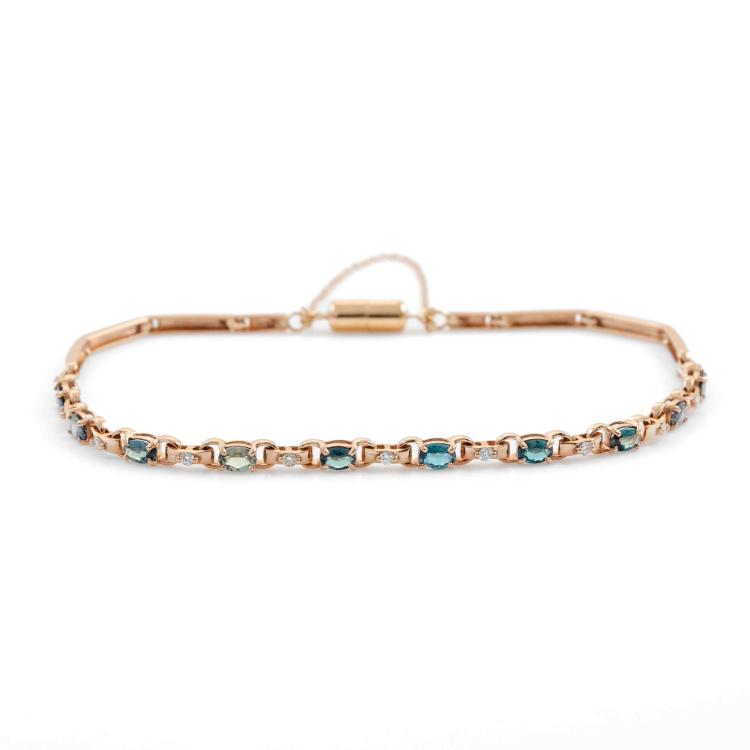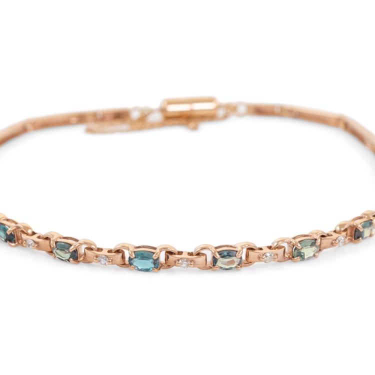Alexandrite and Diamond bracelet with oval shape Natural Alexandrites totalling 1.02ct (displaying colour change from bluish green to light purple) and round Natural Diamonds totalling 0.13ct. 18ct rose gold with magnet clasp and safety chain. Length: 19cm. Weight 5.5g. (Pre-owned)