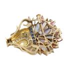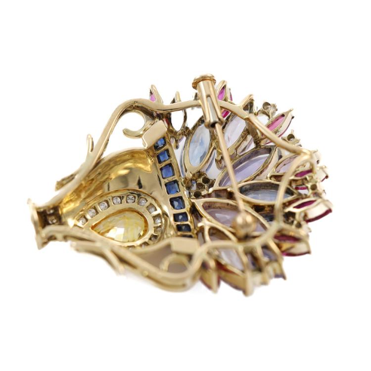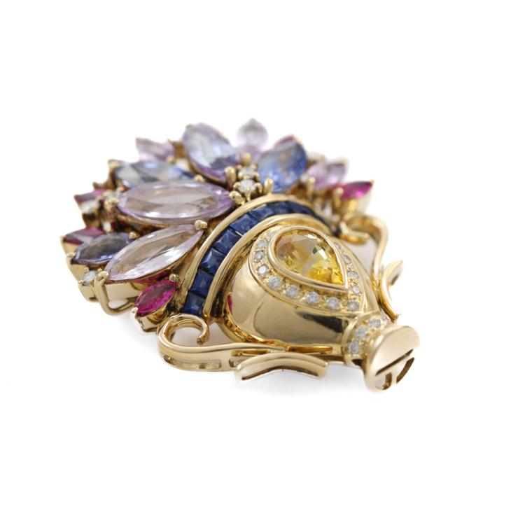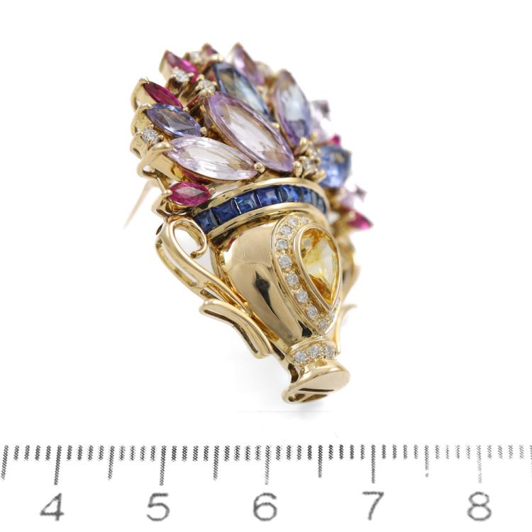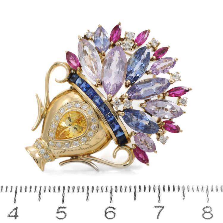 Flower bouquet brooch/pendant with pear shape, marquise & rectangular buff top cut blue & fancy colour Natural Sapphires and rubies totalling 10.39ct and round Natural Diamonds totalling 0.36ct (Estimated grading: H-I SI). 18ct yellow gold. Brooch size: 3.8cm x 3.1cm. Weight:14.7g. With Certificate #419217. (Pre-Owned)